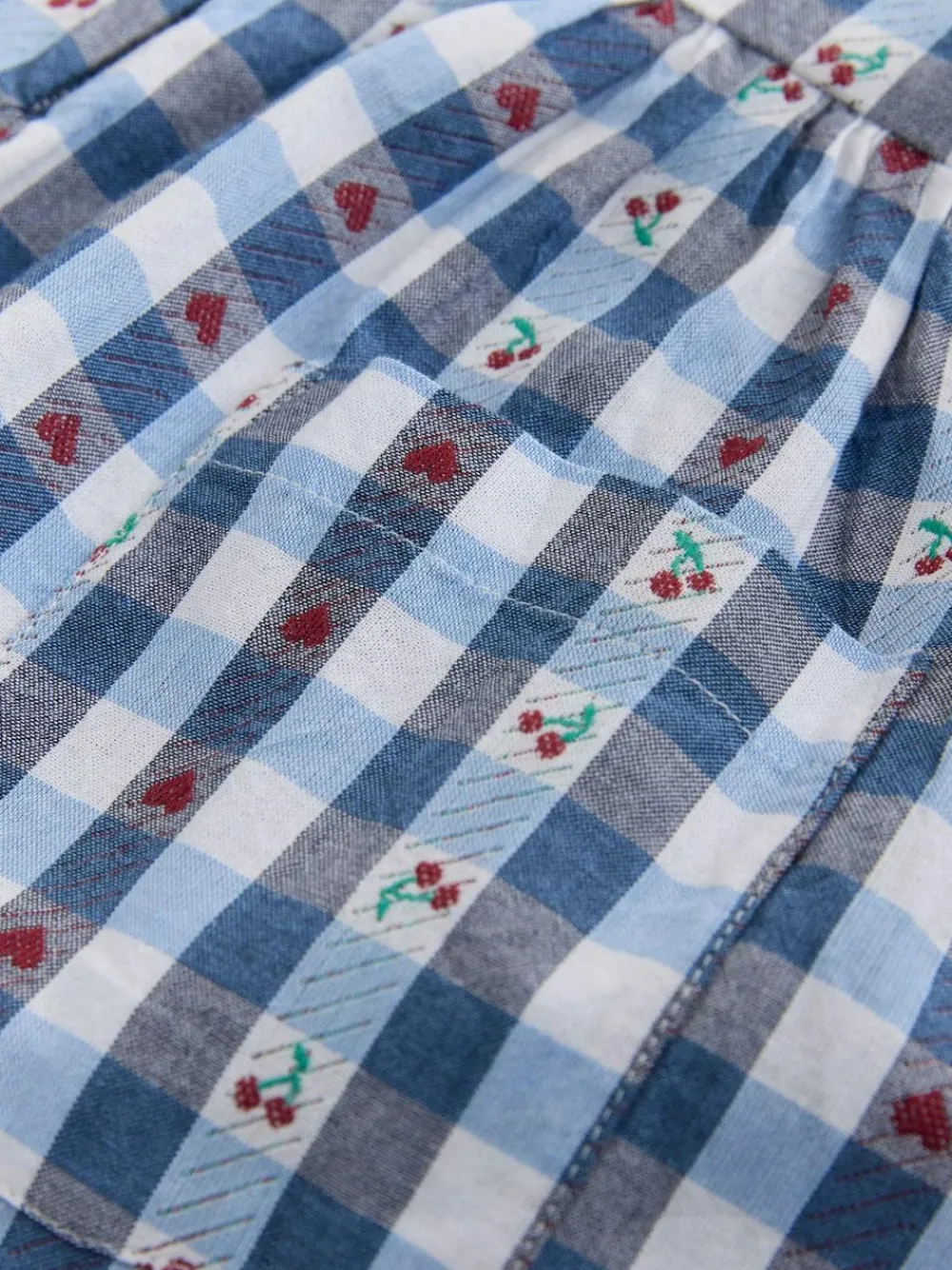 This Blue Gingham Trapeze Playsuit is a charming sleeveless one-piece solution for warm-weather fun. The lightweight, airy fabric features a classic grid design layered with a subtle printed motif. Sleeveless playsuit with a comfortable high waist. Classic grid design in blue and white gingham. Subtle printed motif featuring small cherry graphics throughout. Natural-look buttons down the front for easy fastening. Practical front patch pockets and wide legs for all-day comfort. 83% Cotton, 17% Polyester.