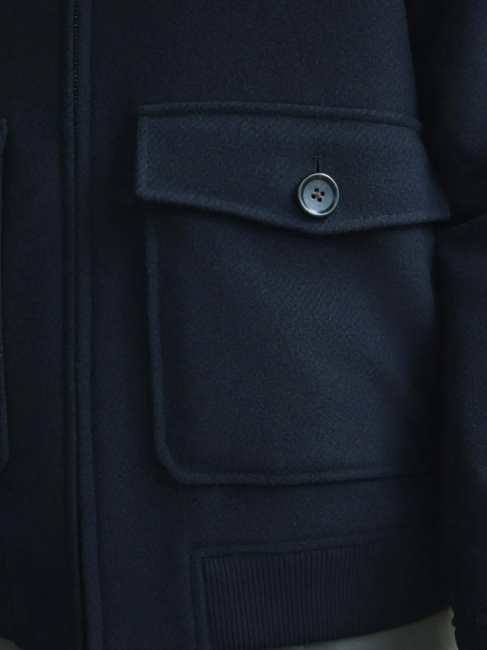 Elevate your cold-weather layering with this sophisticated wool blend jacket. Coming in navy, the tonal borg collar and fully lined interior provide a warm, comfortable feel. Featuring a practical double-ended zip and stylish flapped chest pockets, it’s a versatile piece perfect for a smart-casual, refined look. Twill-wool blend Tonal borg collar Double-ended zip Fully lined Flapped chest pockets Regular fit Jacket Dry clean only Main 66% Recycled polyester, 28% Recycled wool, 3% Nylon, 2% Acrylic, 1% Viscose. Lining 100% Recycled polyester.