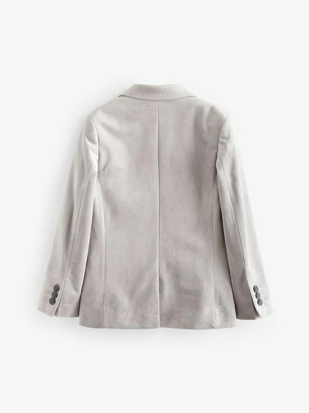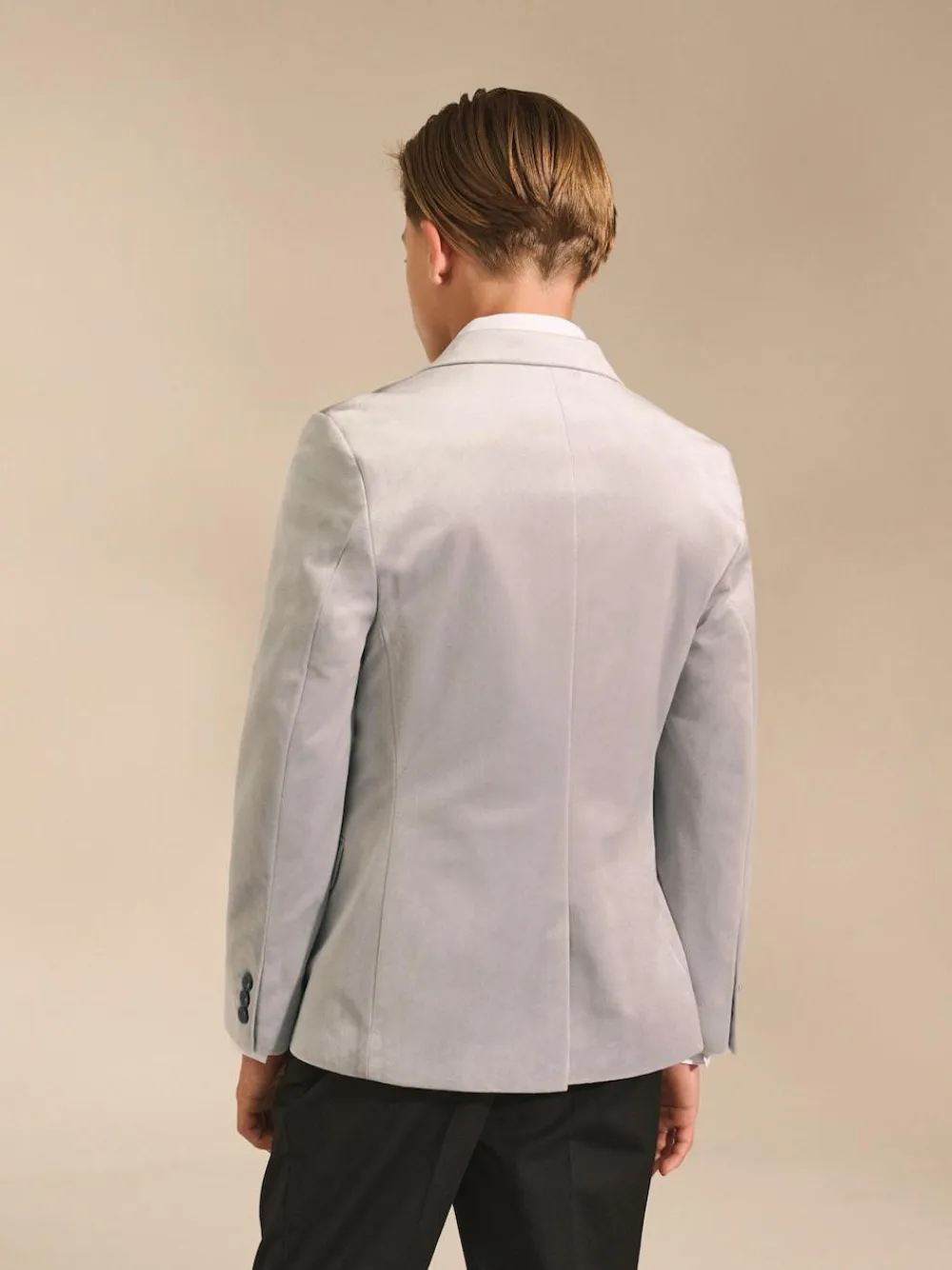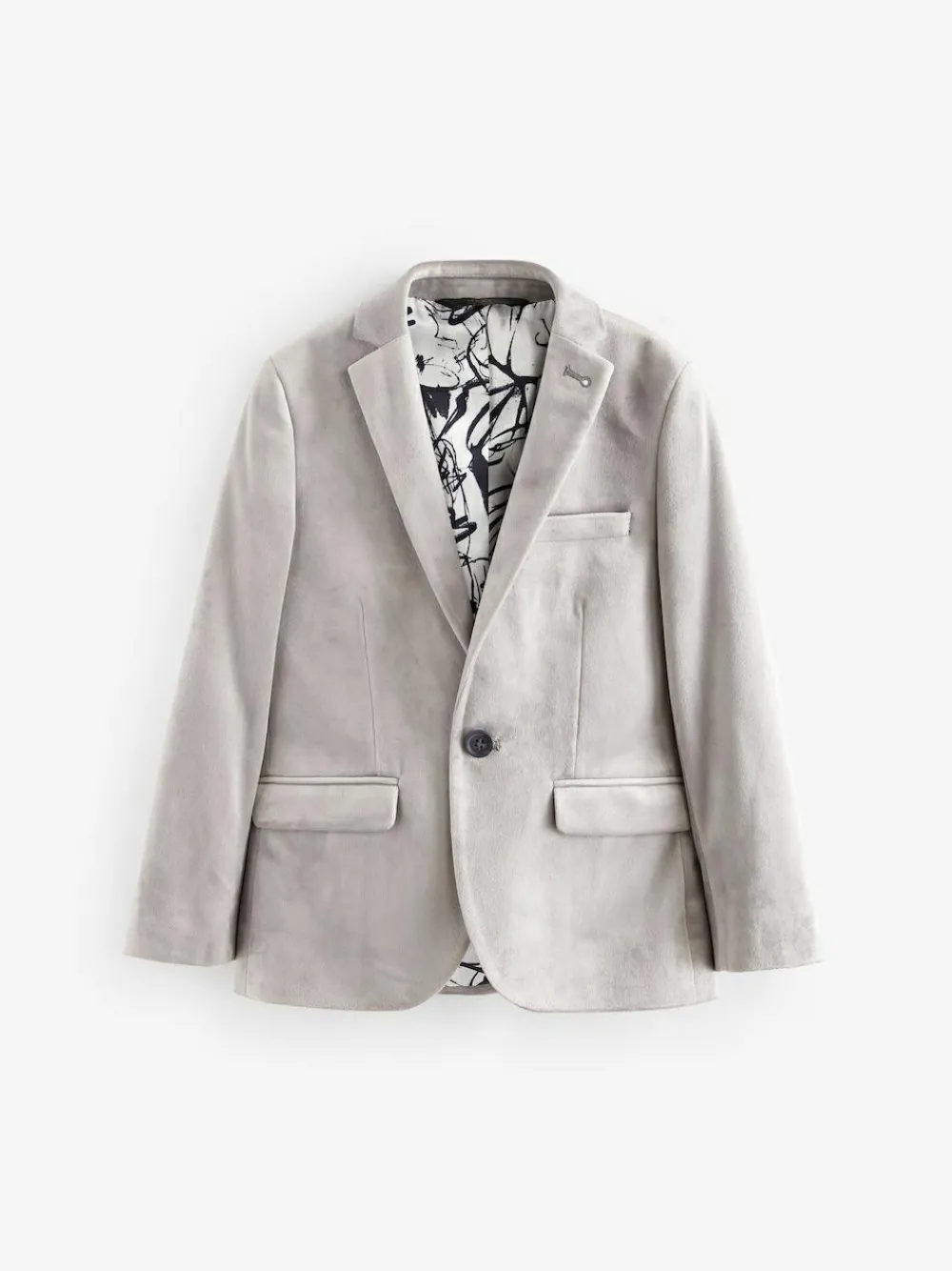 They’ll look the part in this unique and stylish grey blazer jacket, crafted from a soft and plush velvet fabric in a single breasted design with a button-up fastening, a lapel collar and dual flap pockets, finished with a single chest pocket. Regular fit Velvet fabric Single breasted Button-up fastening Flap pockets Single chest pocket Machine washable. Main 100% Polyester. Lining 50% Recycled polyester, 50% Polyester.