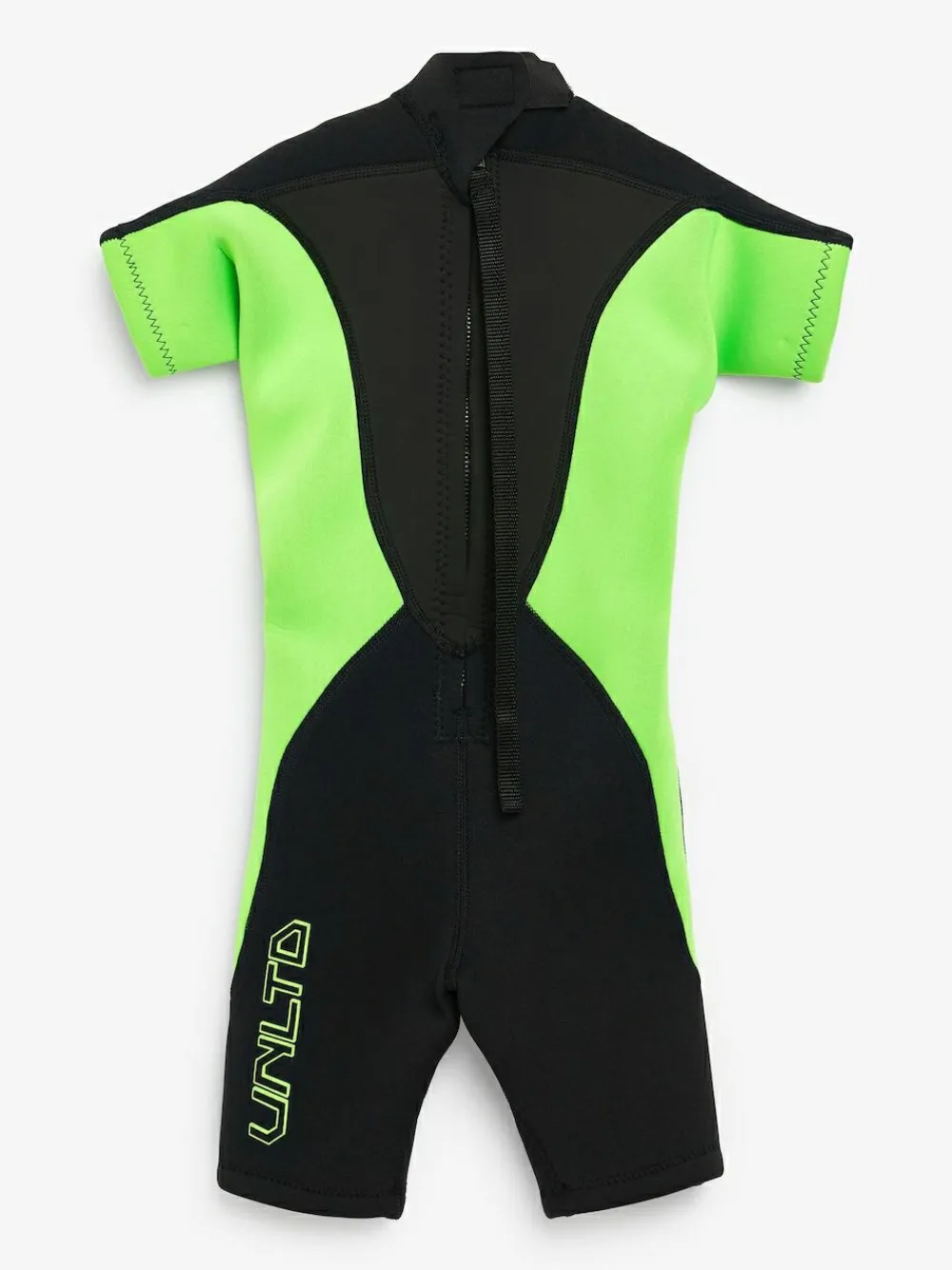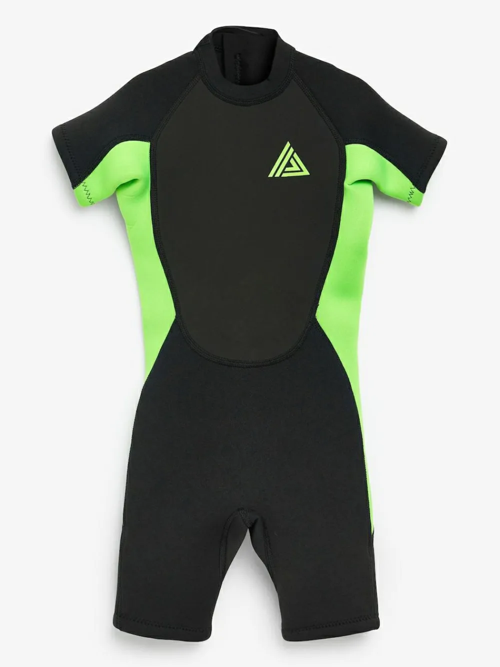 Make waves in this wetsuit with long zip for easy black and green short sleeve dressing. Constructed with neoprene material to keep little surfers warm. Machine washable. Outer 100% Polyester. Inner 100% Neoprene. Lining 100% Polyester.