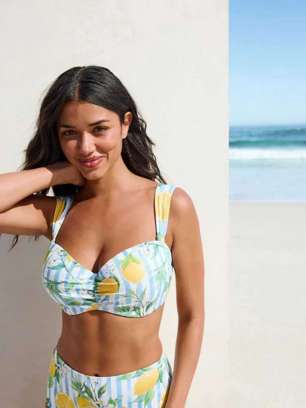 We love the simplicity of this bandeau bikini top. The bandeau style features moulded cups for a feminine shape, underwired for a gentle lift. Use the detachable straps for extra support when you need them, or go strapless to avoid those pesky tan lines. Our shape-enhancing bandeau bikini top features light padding to provide flattering support with removable straps. Buy in your normal cup size for a perfect fit, available in a wide range of prints and colours with a variety of bikini bottoms to match back with. Bandeau bikini top Detachable straps Underwired design Matching bottoms available Main 96% Recycled polyester, 4% Elastane. Mesh 88% Nylon, 12% Elastane. This fabric complies with BS EN 13758 – 1, providing protection against solar ultraviolet radiation. It has been independently tested and given a UPF rating of 50+ which blocks more than 97.5% of UV rays. Important Advice: • Sun exposure causes skin damage • Only covered areas are protected • Always use a high protection factor sunscreen on any exposed areas of skin • The protection offered by this fabric may be reduced with use or if stretched or wet • Always rinse in fresh water after each use • Fabric provides UVA +UVB protection from the sun.