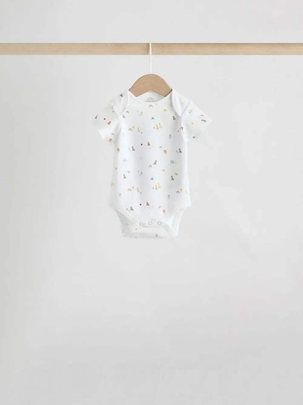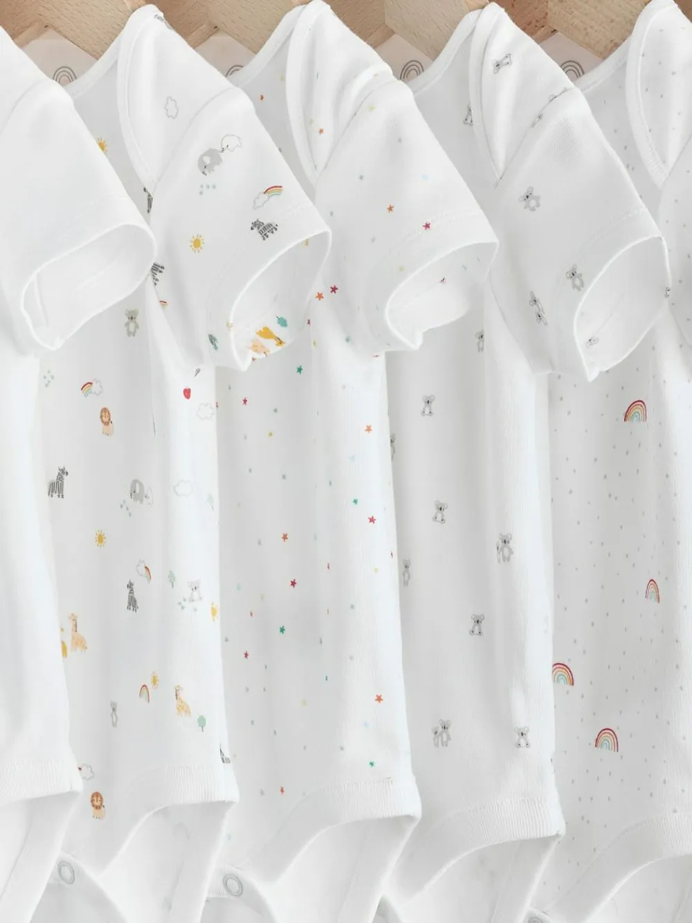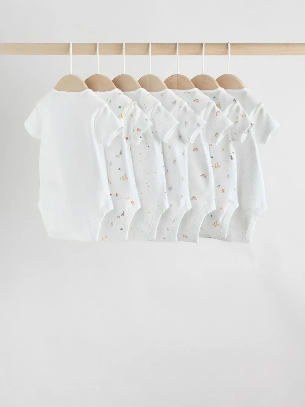 Stock up on a daily essential with this seven-pack of short-sleeve, white bodysuits. The super-soft cotton fabric and envelope neck opening provide a comfortable and gentle feel, while the nickel-free popper fastenings ensure easy changes and protect against irritation. 7-pack Super-soft cotton Envelope neck opening Popper bottom fastening Nickel-free poppers Character print Machine washable. 7 x Bodysuit 100% Cotton. Warning: Keep away from fire and flames.