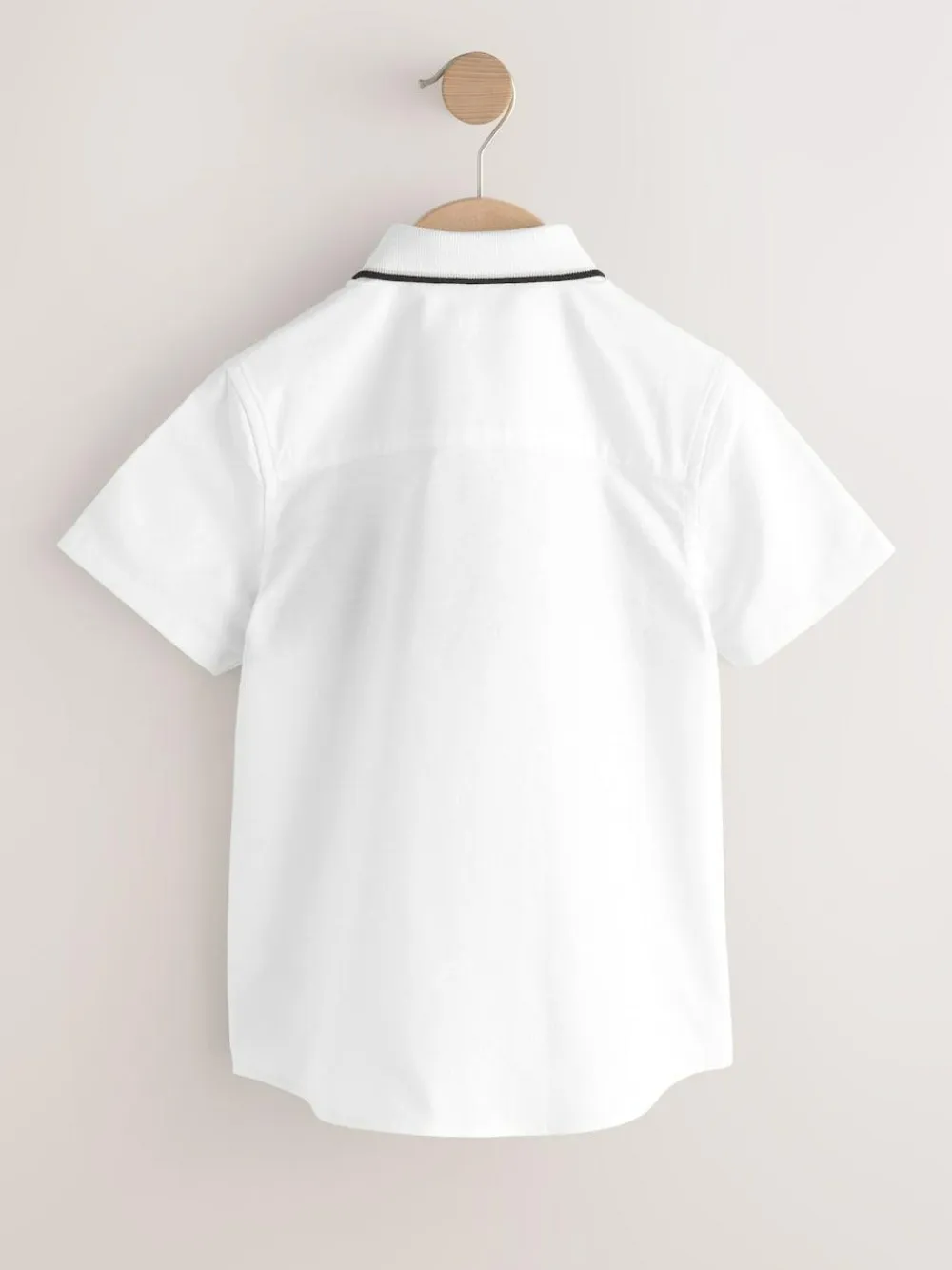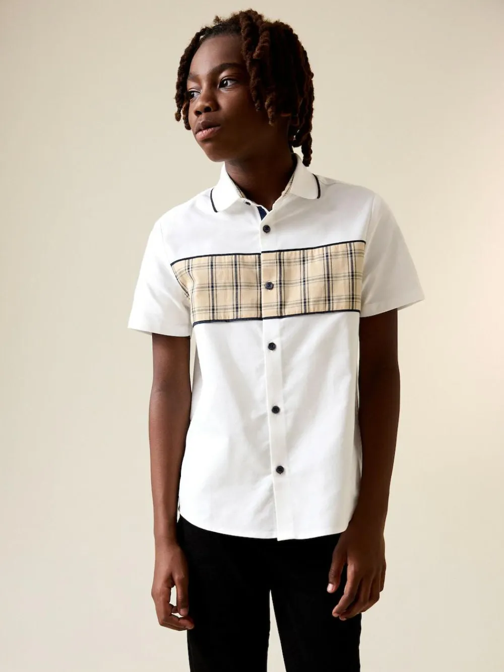 Ready for any smart occasion, this white short-sleeved shirt is a stylish update to his wardrobe. The classic fit and crisp fabric are elevated by a modern check panel across the chest and a contrasting jersey collar. It is a versatile shirt that effortlessly blends smart style with all-day comfort. Jersey collar Check panel Short sleeves Button-up fastening Chest pocket 100% Cotton.