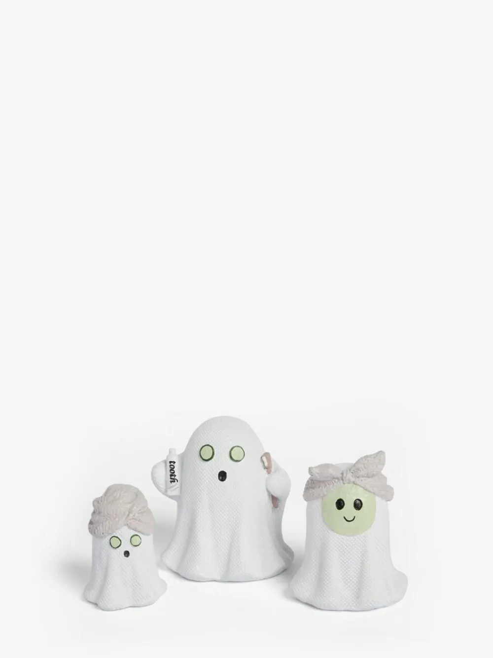 Our set of 3 towel ghosts is enjoying a spooky spa day! Hand-decorated in resin, our adorable bathroom ornaments are the perfect way to update your decor this Halloween. Height 8.5cm Width 8cm Depth 7cm 100% Resin. This item has been tested to ensure it is bathroom suitable and protects against corrosion and distortion from steam.