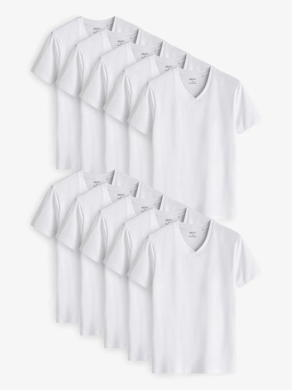 Stock up on style staples with this handy 10-pack of white T-Shirts, featuring a pure cotton construction with a ribbed V-Neck collar, finished with short sleeves. Slim fit 10-pack 100% Cotton V-Neck collar Designed in a slimmer fit to wear comfortably underneath other garments. Machine washable. 10 x T-shirt 100% Cotton.