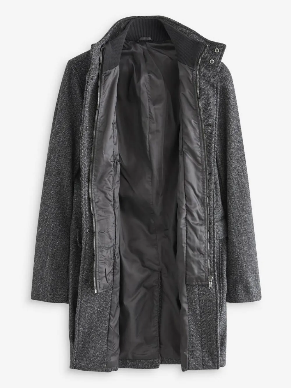 Smart and practical, our charcoal grey funnel neck coat is a clever addition to your outerwear layers. Designed with pockets to keep your hands warm, a cosy funnel neck and ribbed cuffs to help keep out any drafts. A stitched internal gilet provides further warmth on colder days. Smart and practical Funnel neck Stitched internal gilet Versatile style Dry clean only. Main 39% Recycled polyester, 33% Recycled wool, 23% Viscose, 3% Nylon, 2% Acrylic. Backing 100% Polyester. Lining 100% Recycled polyester. Sleeves 100% Recycled polyester.