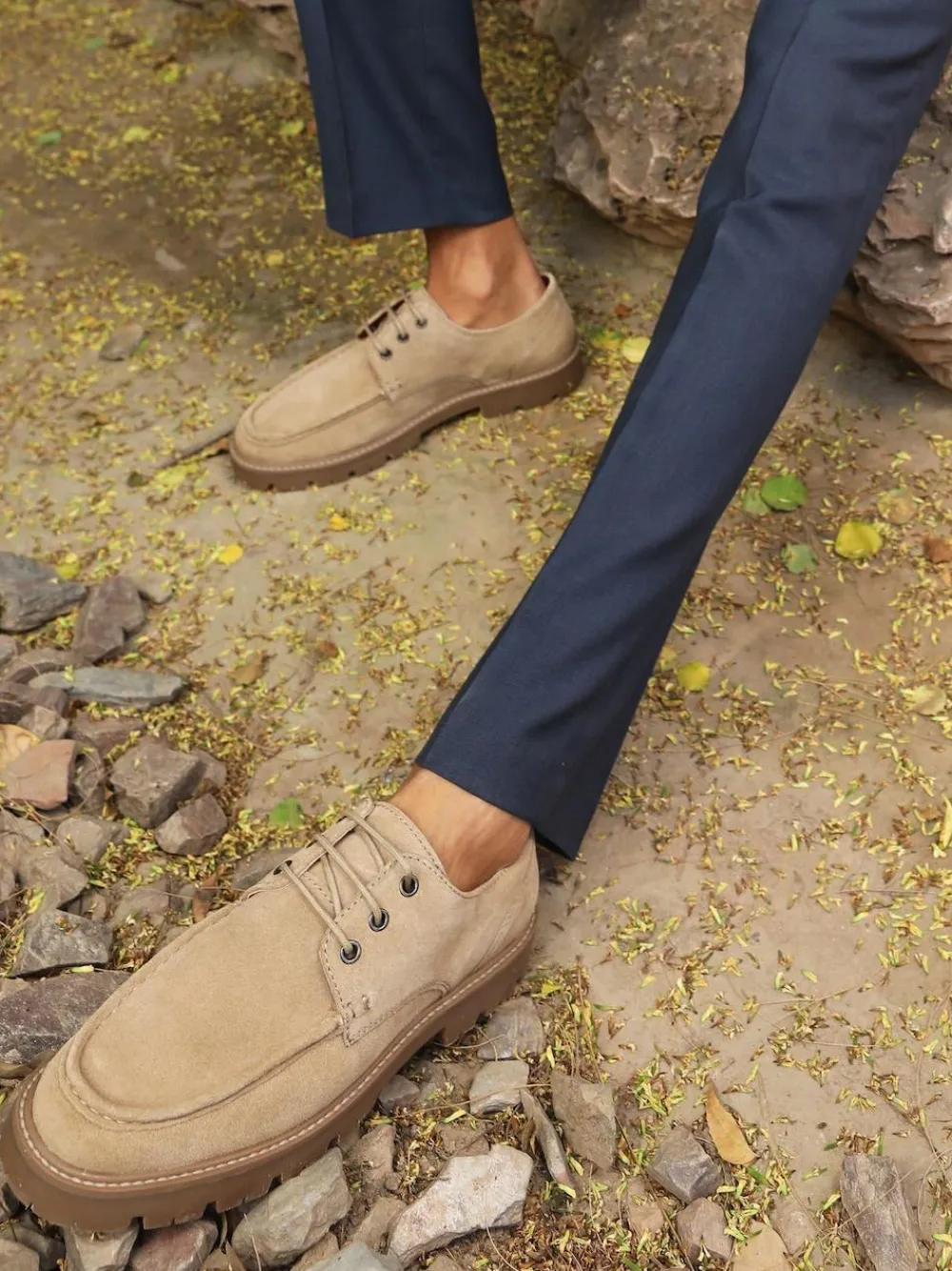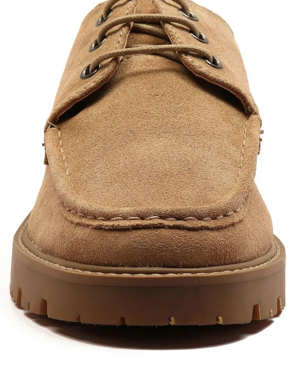 The Harvey boat shoes bring rugged charm to laid-back dressing. Crafted in soft sabia suede with tonal laces and a lug sole, this versatile pair brings easy edge to transitional weather, weekend plans, or casual citywear.. Lace-up closure with moc toe shape. Warm tan suede upper for a natural look. Subtle contrast stitching for added texture. Lug rubber sole offers grip and character. Cushioned insole for all-day comfort. Stay grounded in everyday style—Harvey is made to move with you. Main – 100% Leather. Lining – 100% Other fibres. Sock – 100% Other fibres.