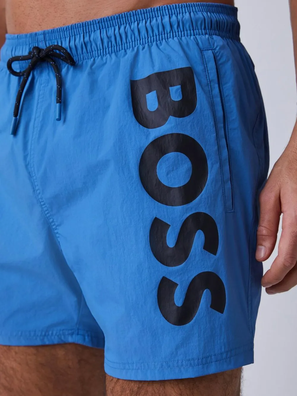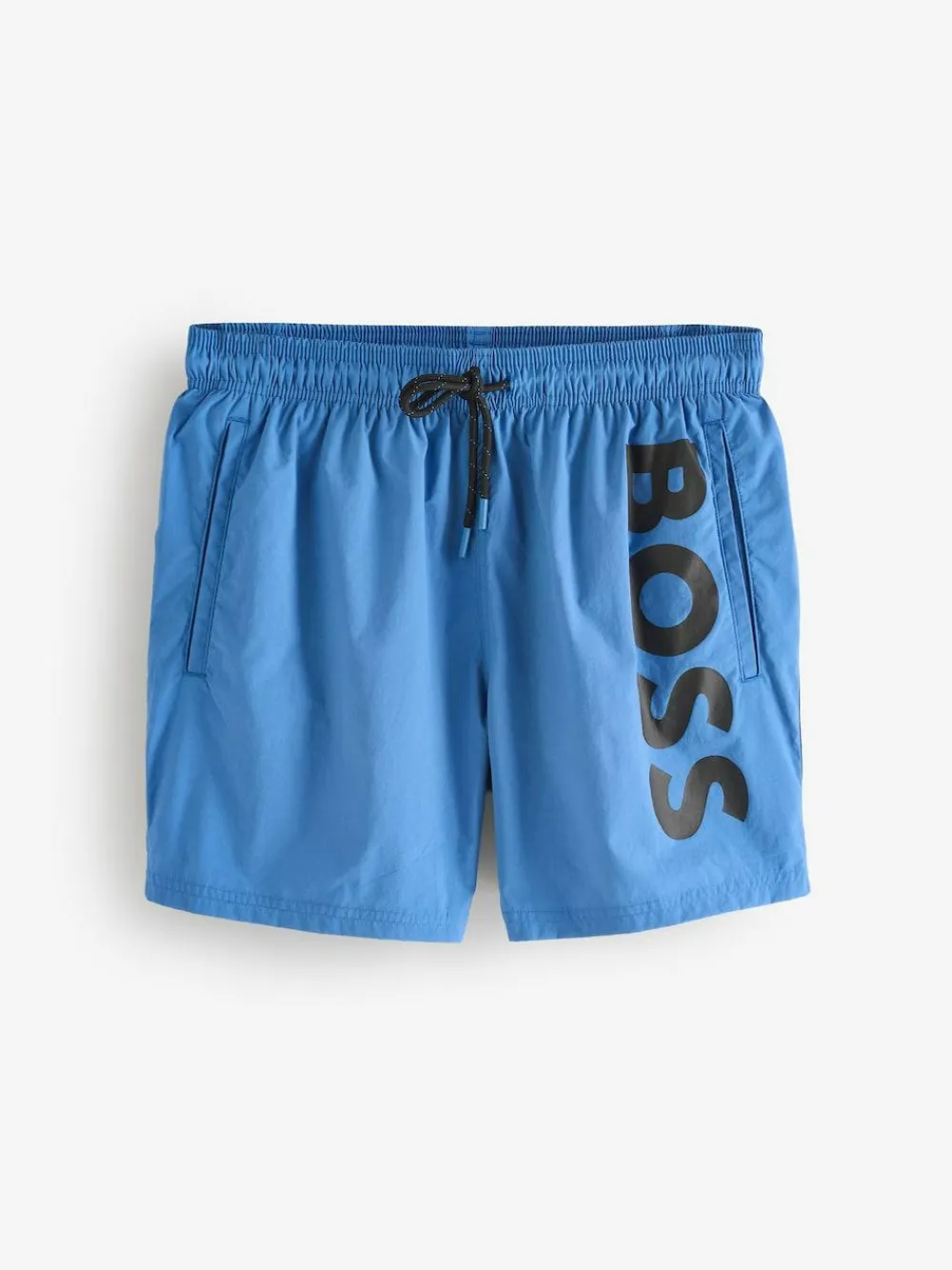 Adjustable blue swim shorts by BOSS in quick-drying fabric with full lining and a vertical logo in contrast. Machine washable. 100% Nylon.