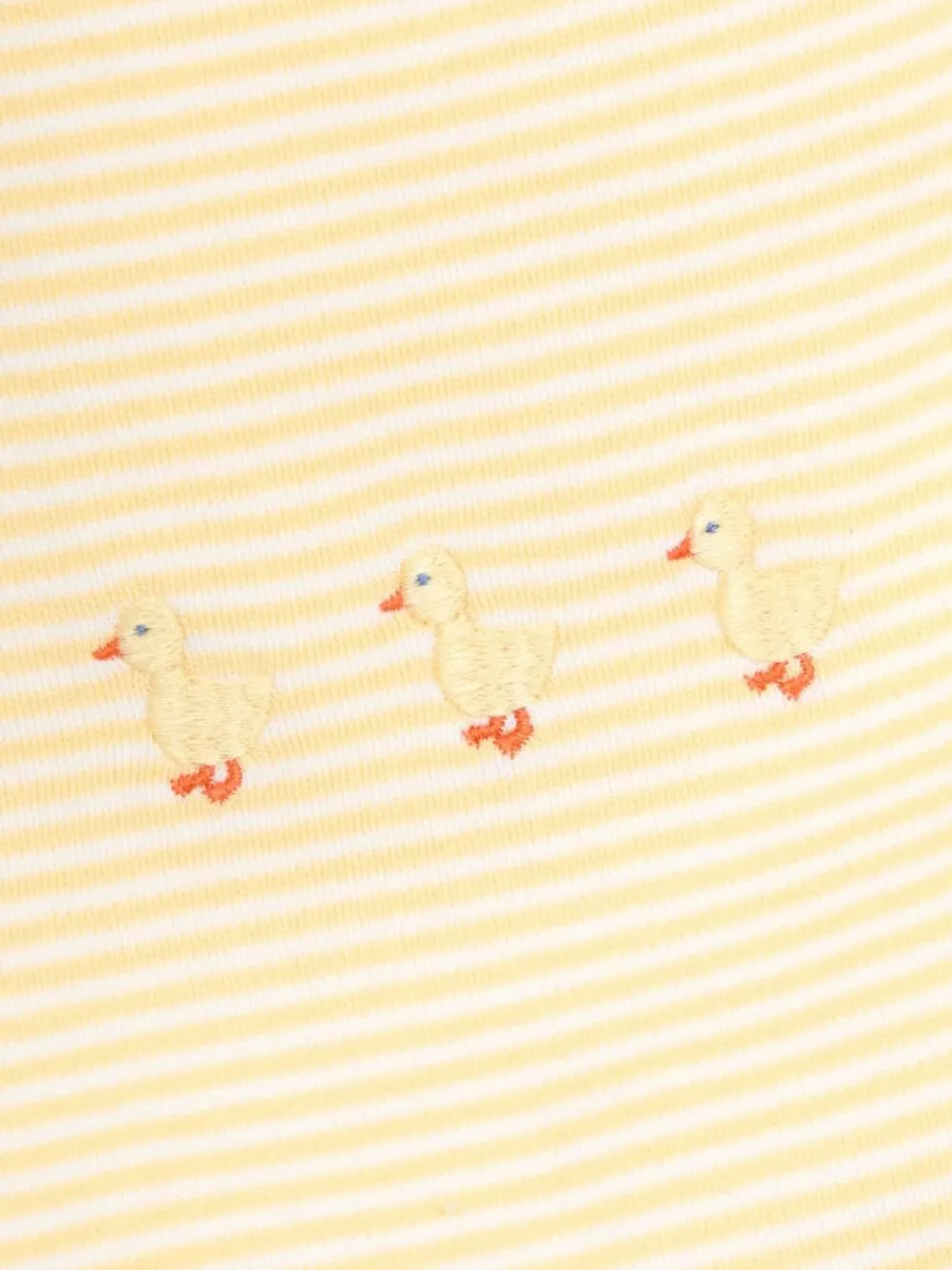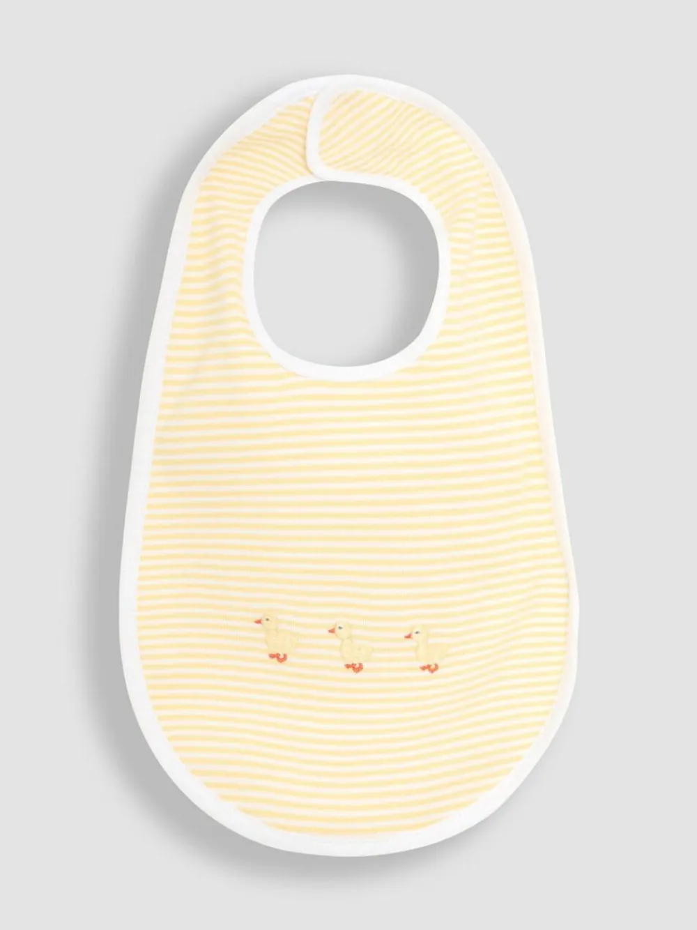 For Messi munching and dribbly nibbles, your little one can never have too many Baby Bibs. This cute cotton bib has a rip-stop fastening, pastel yellow stripes and sweet little duck embroidery, making it a great unisex gift for the new arrival. Ideal gift Yellow stripes and duck embroidery White piping Rip stop fastening Machine washable Main 100% Cotton. Lining 80% Cotton, 20% Polyester.