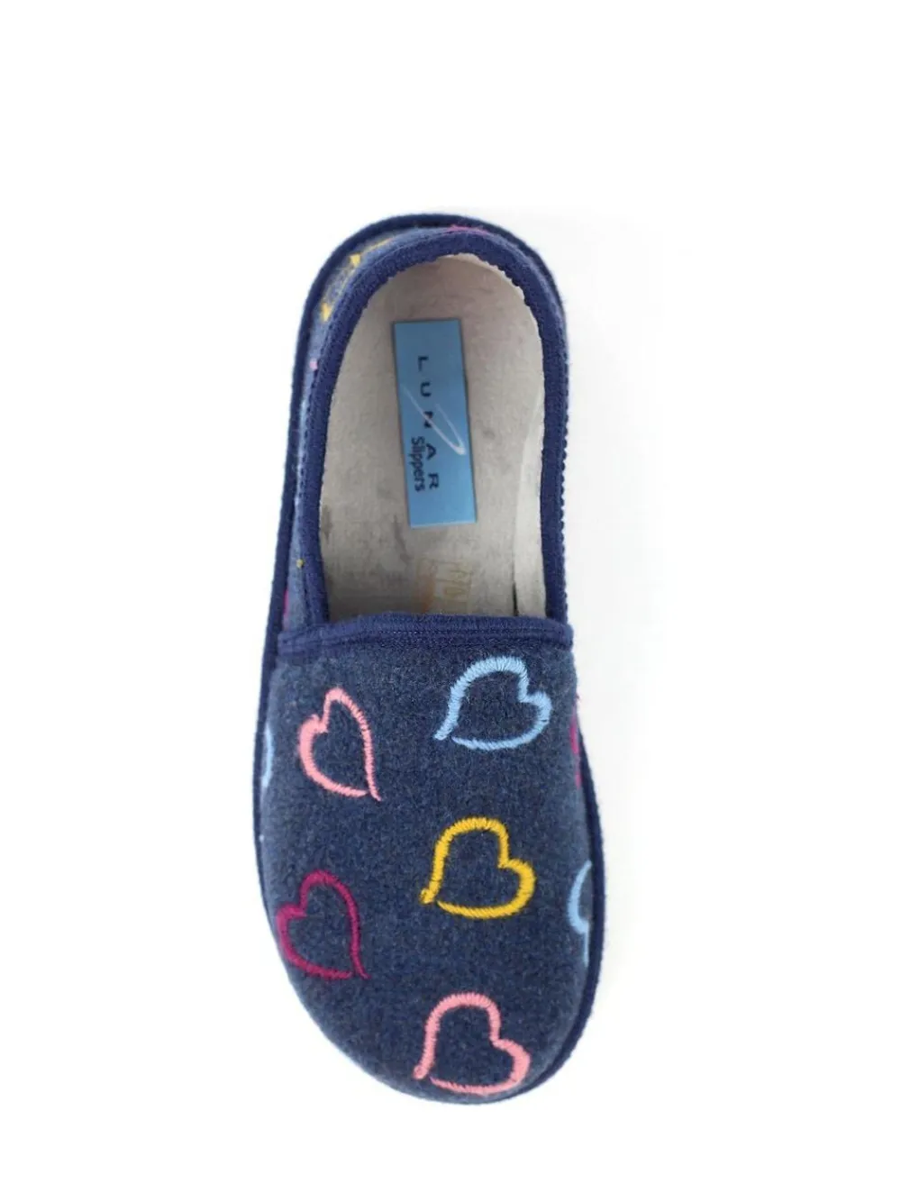 Indulge in cosy comfort with our Joyful navy slippers. Crafted with a felt upper and soft textile lining, they wrap your feet in warmth. The rubber sole ensures durability for indoor wear. Designed for convenience with a slip-on style. Enjoy added comfort with a padded insole and enjoy the heart embroidery in multicolours for a touch of style. Main – 100% Textile. Lining – 100% Textile. Sole – 100% Synthetic rubber.