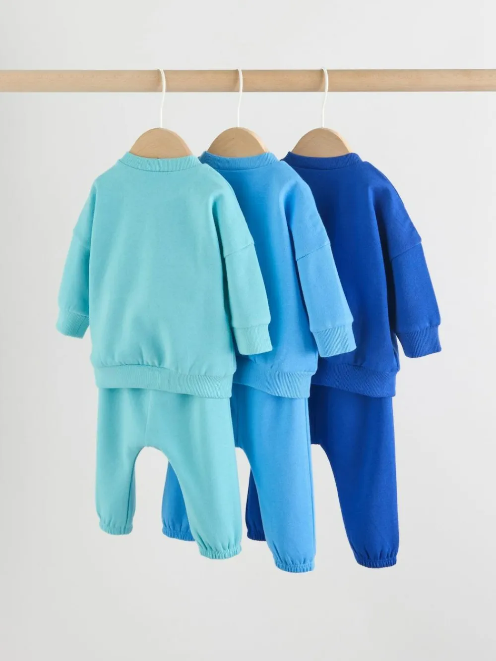 Designed for comfort and versatility, this six-piece set includes three Bright Blue sweatshirts and three pairs of joggers. The plain designs and super-soft cotton fabric make them perfect for mix-and-match styling. Nickel-free poppers on the joggers ensure a gentle fit for delicate skin. 6-pack Sweatshirts and joggers set Super soft cotton fabric Nickel-free poppers Plain designs Machine washable. Sweater, Sweater, Sweater, Jogger, Jogger and Jogger 90% Cotton, 10% Recycled polyester. Warning: Keep away from fire and flames.