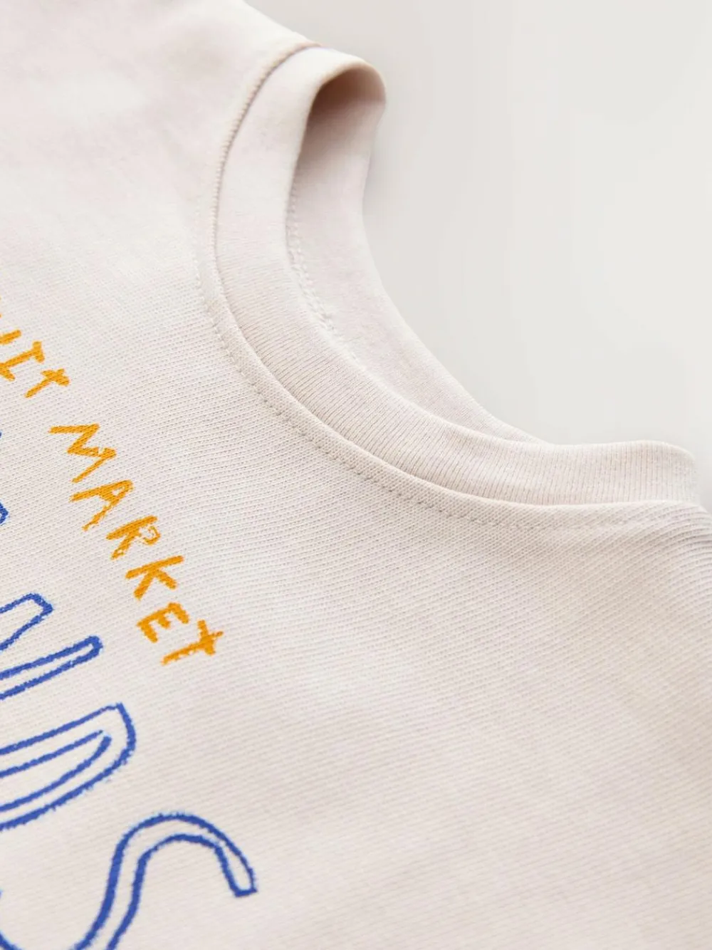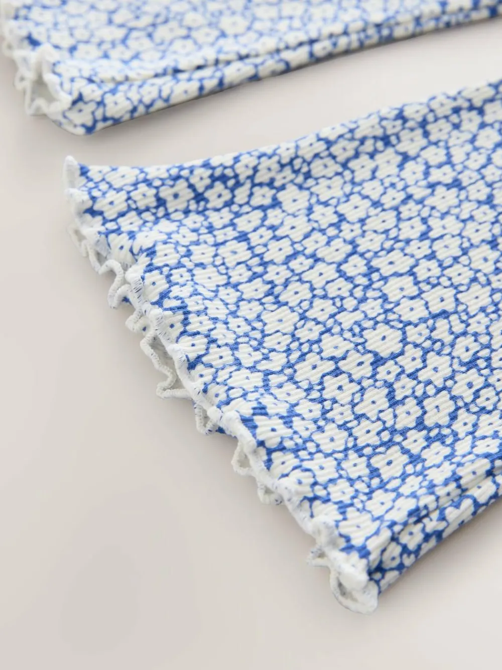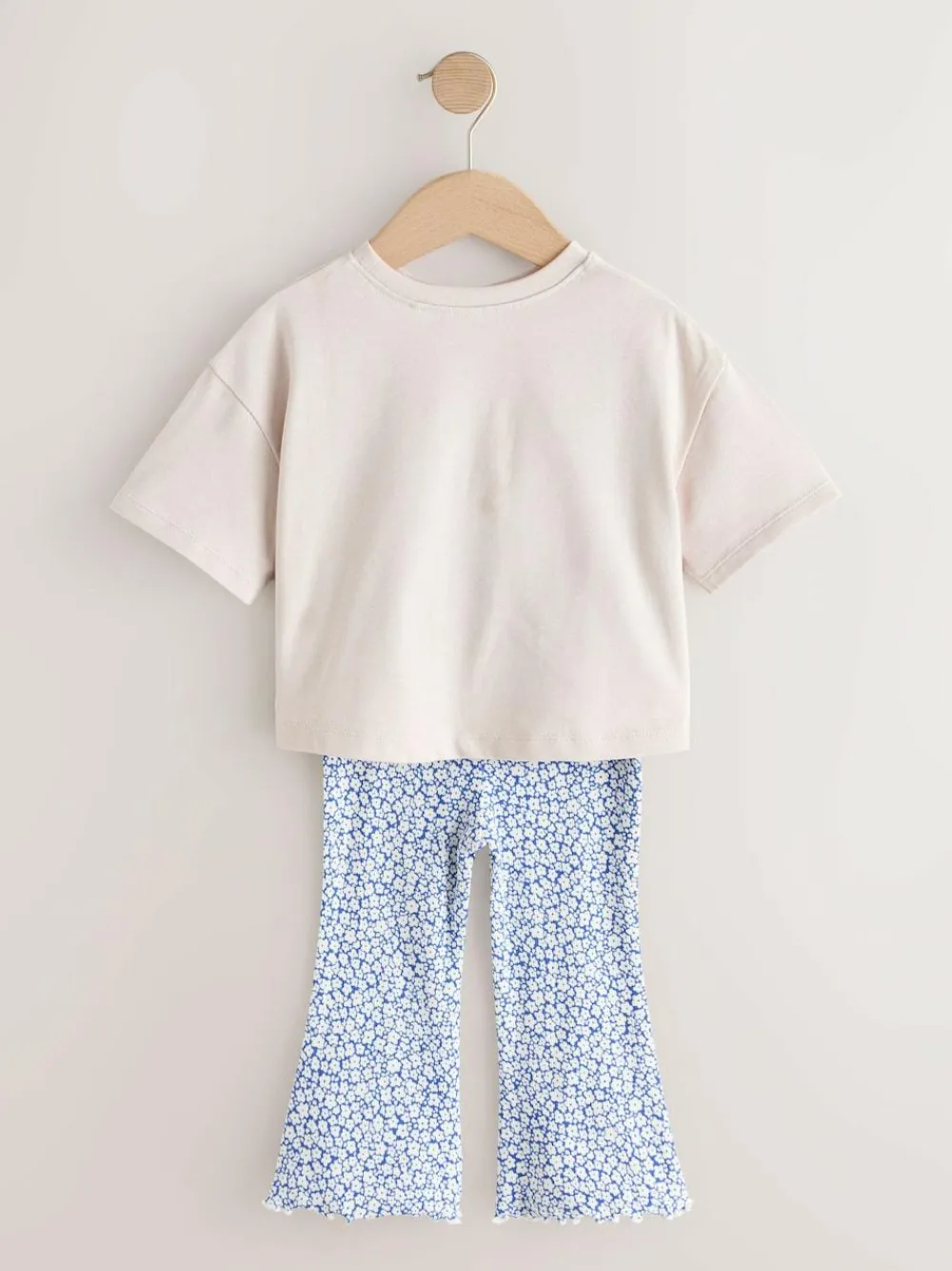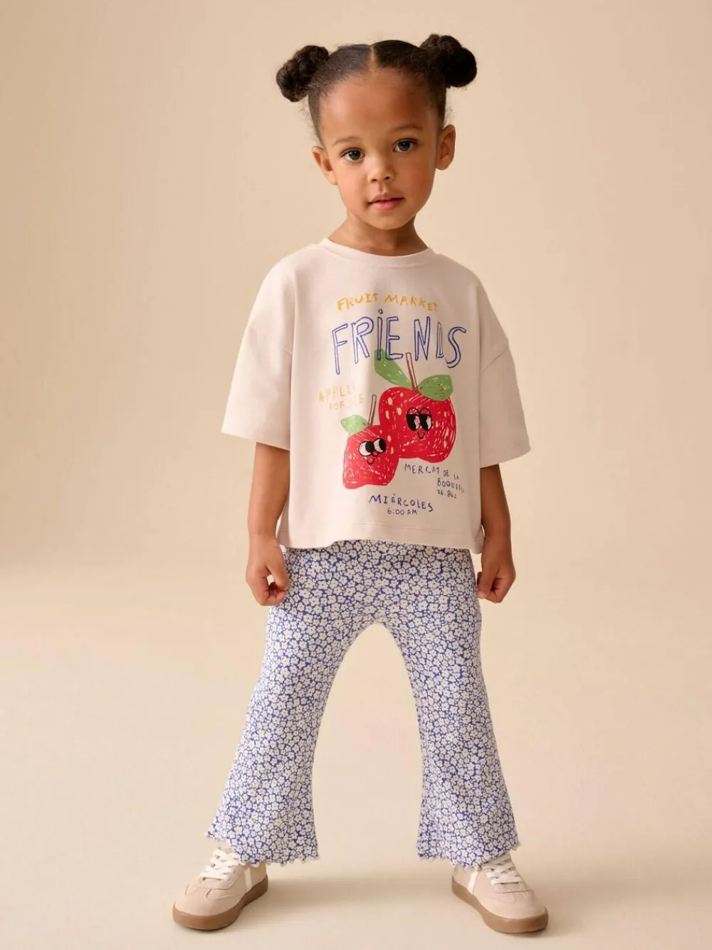 Set your little one up for playtime in this sweet Ecru White top and leggings set. The short sleeve top is a heavyweight t shirt featuring a charming apple character graphic with soft flock details on apple faces. The set is paired with playful blue floral leggings, creating a stylish and comfortable outfit for casual adventures. Flock details on apple faces Heavyweight t shirt Short Sleeve Top Leggings Set Machine washable. T-shirt 100% Cotton. Leggings 94% Cotton, 6% Elastane.