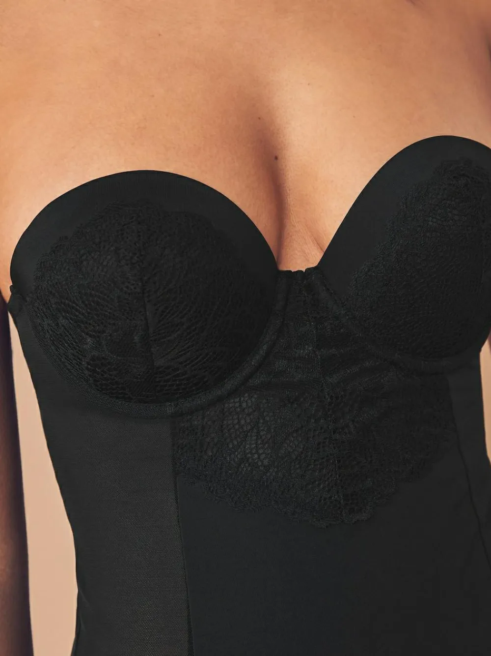 Slip into our firm tummy control cupped lace body for ultimate confidence. Crafted from a blend of nylon and elastane with a touch of cotton for that extra softness, it discreetly shapes and smooths your silhouette for your favourite body-hugging outfits. Featuring multi-way straps, this lace body can be worn regularly, strapless, halterneck, or cross-back, so it’s always ready to adapt to your outfit. The elegant lace detailing adds a delicate feminine touch for that extra elegance. Lace body Multi-way straps Tummy control Machine washable. Main 78% Nylon, 18% Elastane, 4% Polyester. Gusset 100% Cotton.