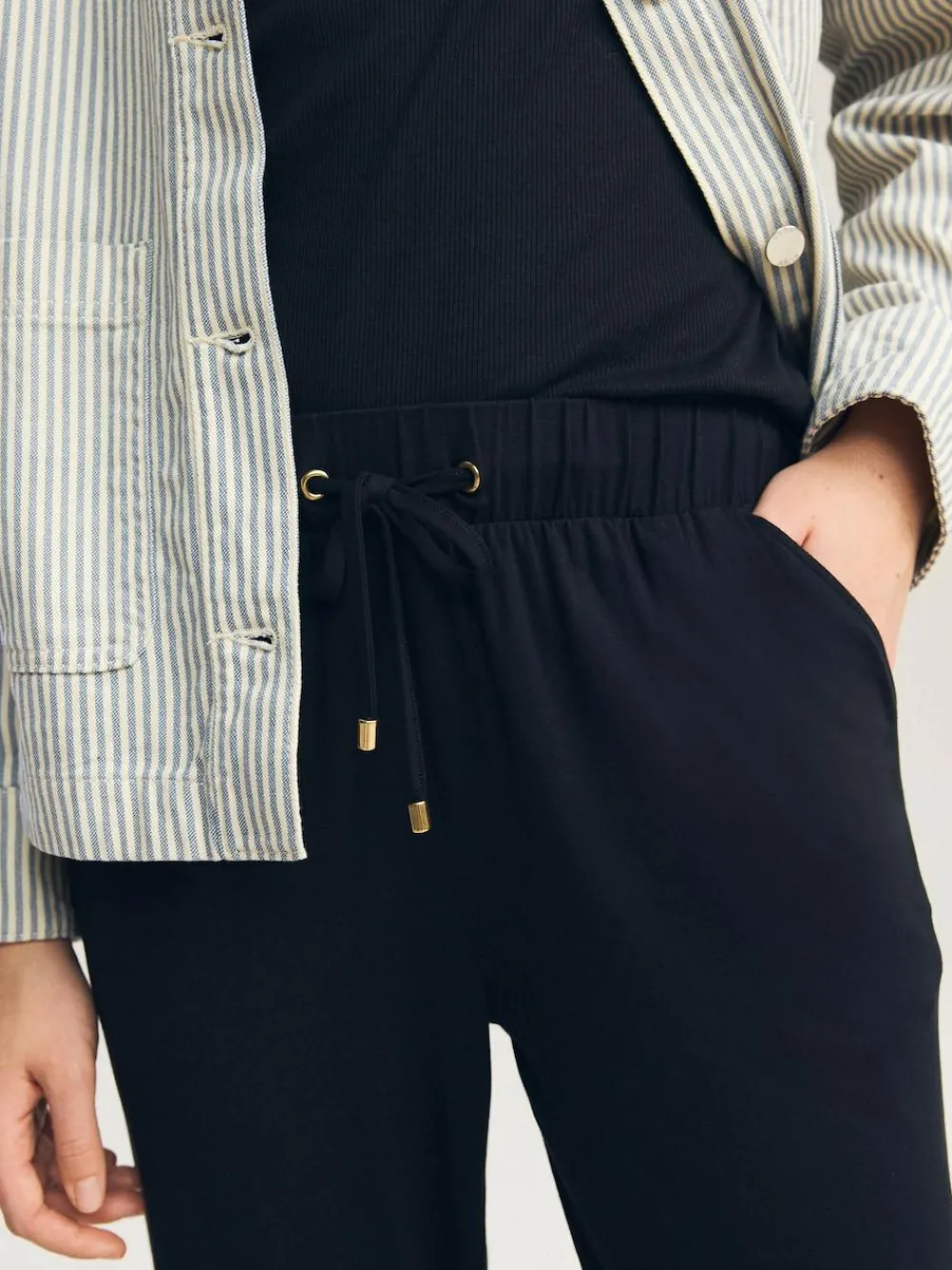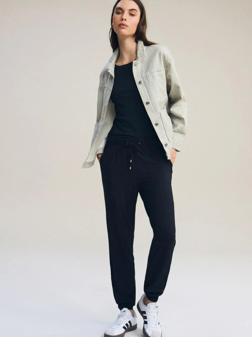 Our black jersey joggers are a casual and comfortable wardrobe hero. Made from breathable material with added stretch, you’ll love the easy pull-on style and the tapered leg shape for a touch of modern chic. Pair with your favourite T-Shirt for easy lounging or a quick coffee run. Pull-on style Tapered leg fit Soft jersey fabric Regular to fit inside leg 29″ / 74cm. Long to fit inside leg 31″ / 79cm. XL Tall to fit inside leg 33″ / 84cm. Machine washable. 95% LENZING™ ECOVERO™ Viscose, 5% Elastane. Items with the curve logo are available in sizes 18 and above., Our tall collection is designed to fit women 5’10” and above. This has been proportionally increased through the body, leg and sleeve to achieve the perfect fit. Available in sizes 8-20.