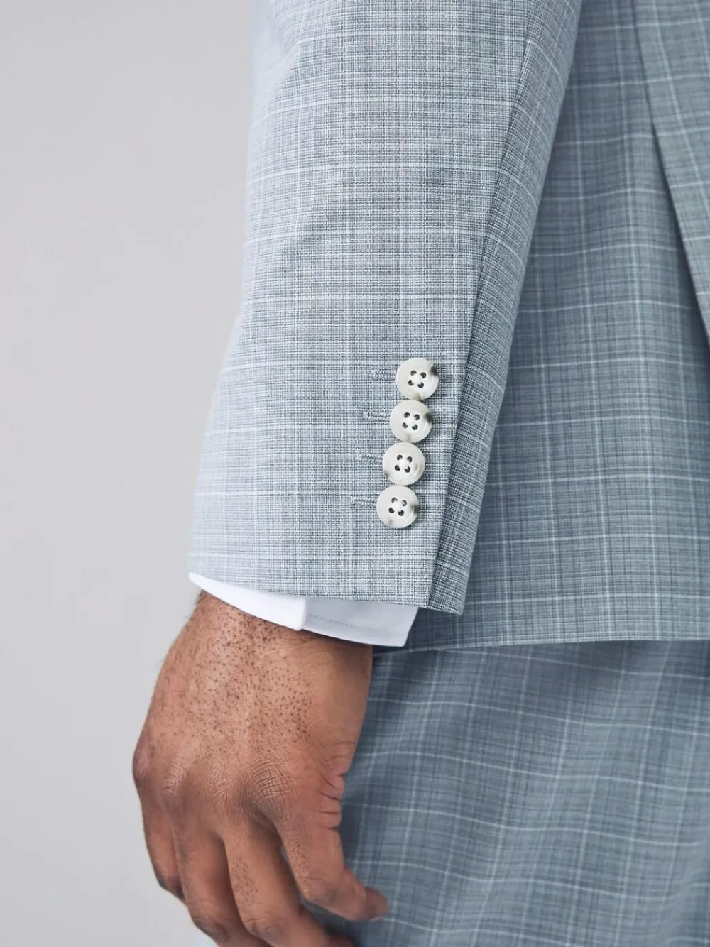 In a light blue check, this slim fit jacket has a smart design with a single-breasted front, a button-down fastening and a lapel collar, finished with a pull-out chest pocket, flap front pockets and a smooth lining. Matching trousers available. Slim fit Single breasted Button-down fastening Lapel collar Flap pockets Pull-out pocket square Main 50% Recycled polyester, 28% Viscose, 16% Polyester, 6% Elastane. Lining 100% Recycled polyester.