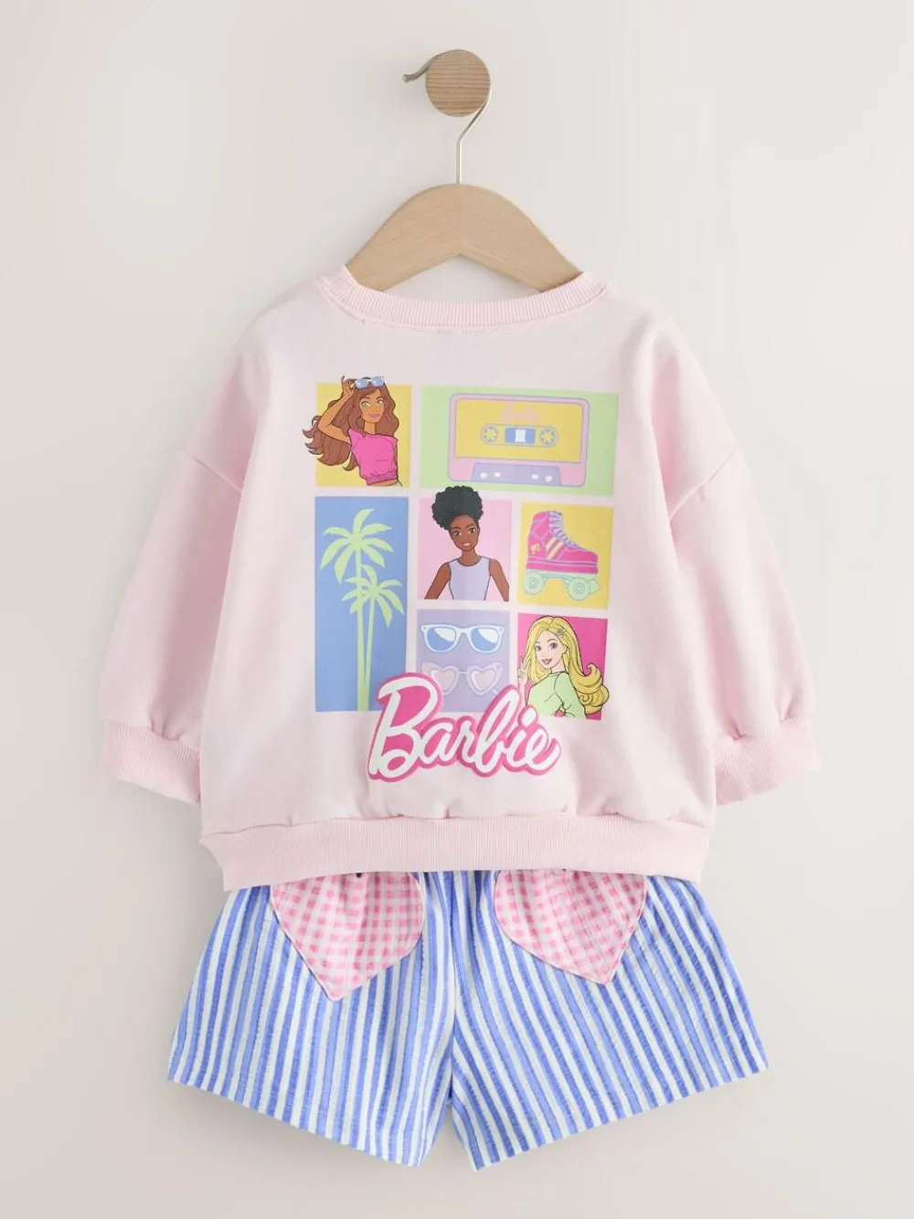This fun Pink Barbie Shorts Set is a cute casual outfit for her wardrobe. The set features a brush back sweat top with a large Barbie graphic print on the back. The coordinating striped shorts have charming love heart pockets detail and a small Barbie logo embroidery. Barbie graphic and logo Love heart pockets Brush back sweat top Striped shorts Sweater 85% Cotton, 15% Recycled polyester. Shorts 100% Cotton.