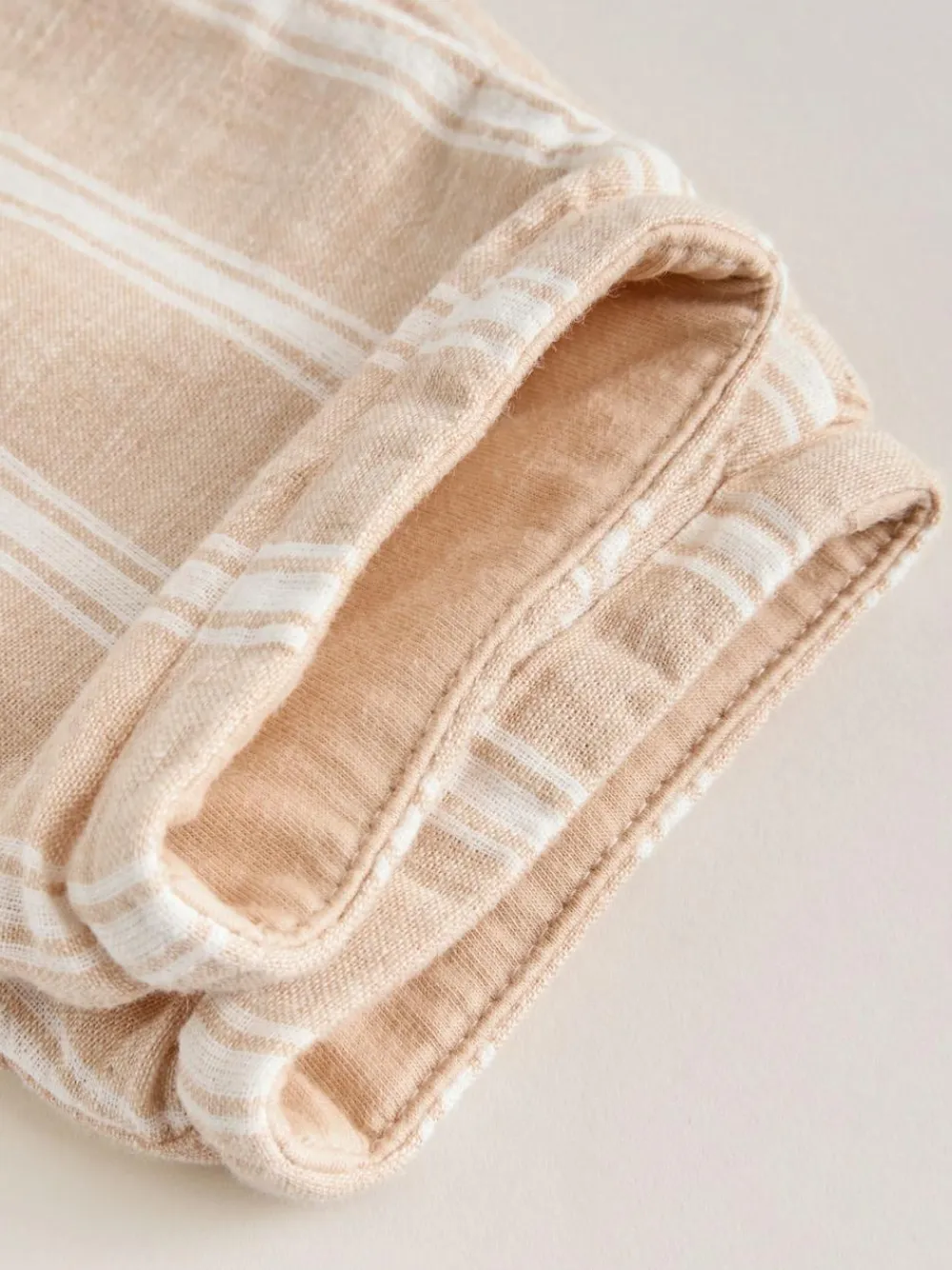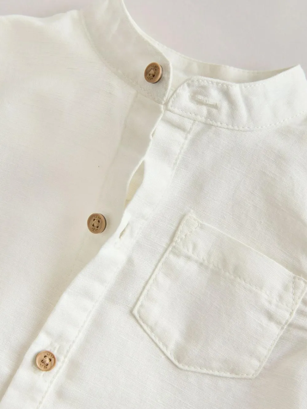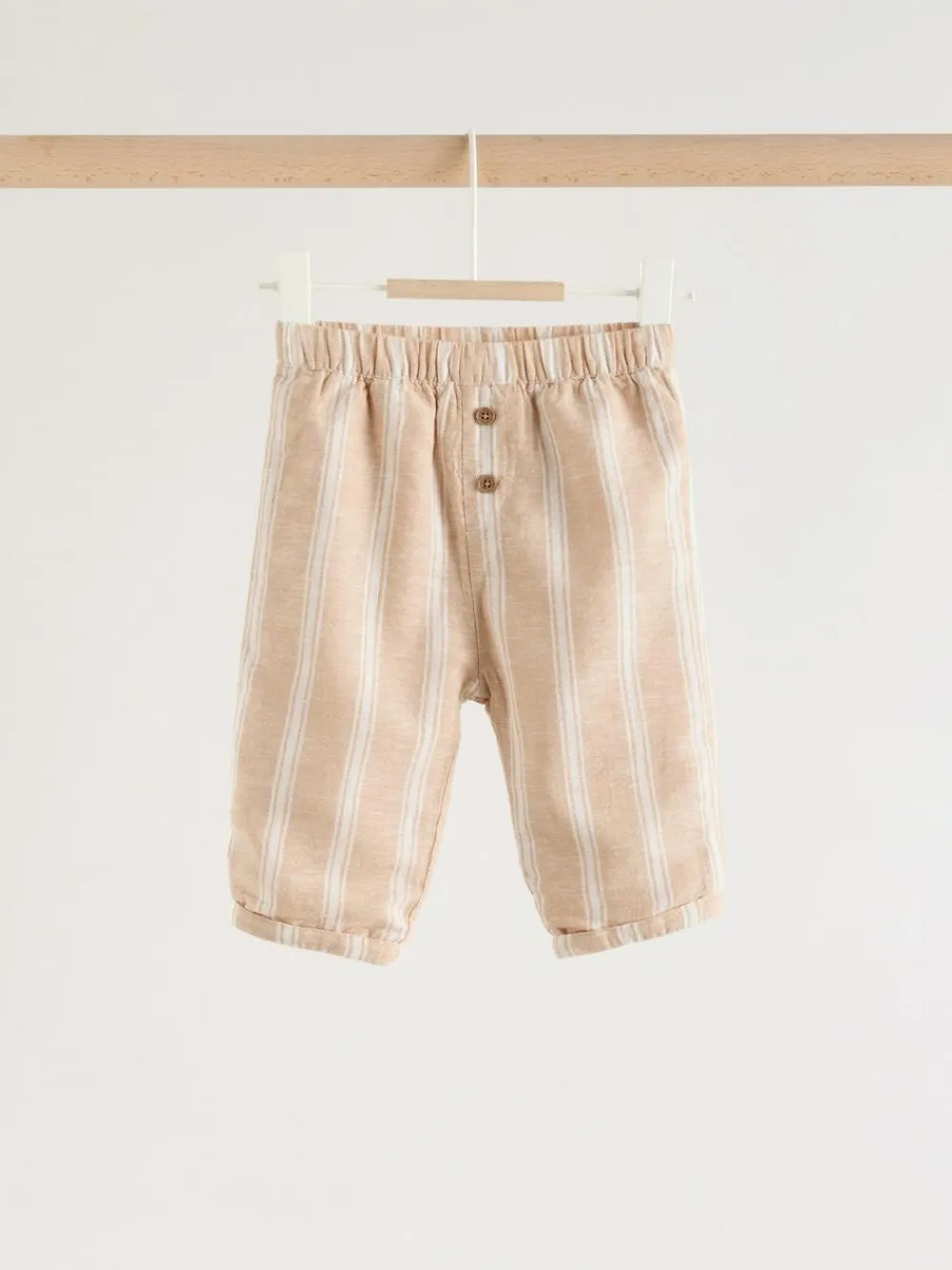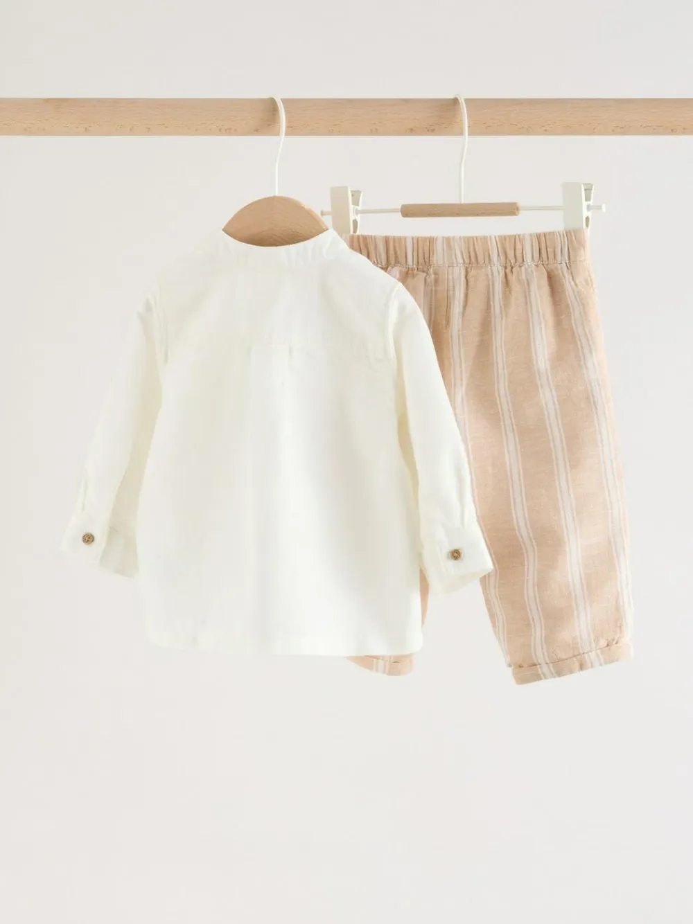 Introduce a charming, coordinated look to the wardrobe with this White Striped Woven Shirt and Trousers Set. The outfit is made from a breathable Linen and cotton blend, perfect for sensitive skin. The shirt features a smart Grandad collar button up shirt, while the coordinating stripe trouser is Fully lined trouser for comfort.Grandad collar button up shirt stripe trouser Linen and cotton blend Fully lined trouser 2 Piece Set Machine washable. Shirt 55% Linen, 45% Cotton. Trouser Main 55% Cotton, 45% Linen. Lining 100% Cotton. Warning: Keep away from fire and flames.