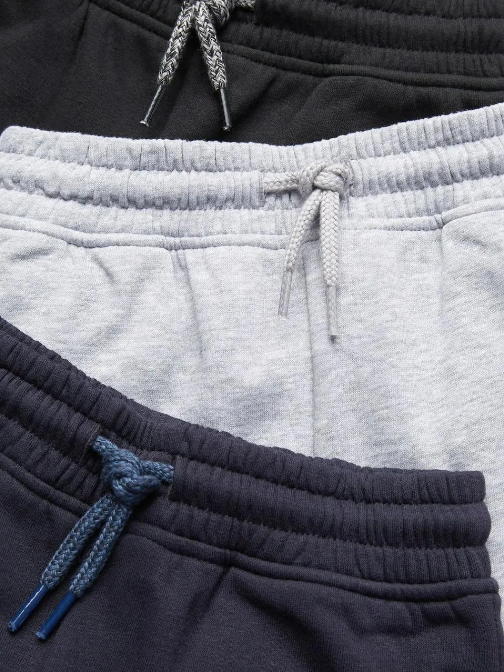 Fill their wardrobe with this three-pack of joggers. In a soft cotton jersey with an elasticated waist, pockets and ribbed hems for a stay-put fit. Soft cotton jersey Elasticated waist Pockets Ribbed hems Slim fit Machine washable. 2 x Jogger navy black 80% Cotton, 20% Recycled polyester. Jogger grey 70% Cotton, 22% Recycled polyester, 8% Viscose.