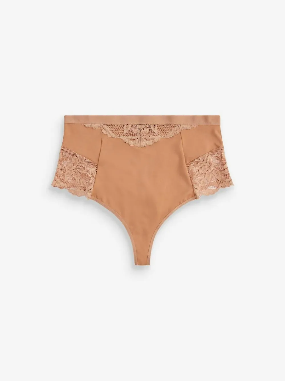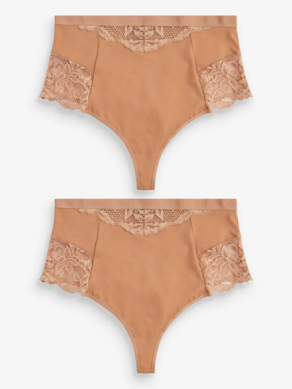 This nude two-pack of shaping thongs are high-waisted for a comfortable and flattering fit underneath any outfit. Featuring soft lace for added feminine detail. Pack of two Lace trim detail High-waist thongs Tummy control Elasticated waistband Cotton gusset Machine washable. 2 x Knickers Main 74% Nylon, 26% Elastane. Lace 84% Nylon, 16% Elastane. Gusset 100% Cotton. Items with the curve logo are available in sizes 18 and above.
