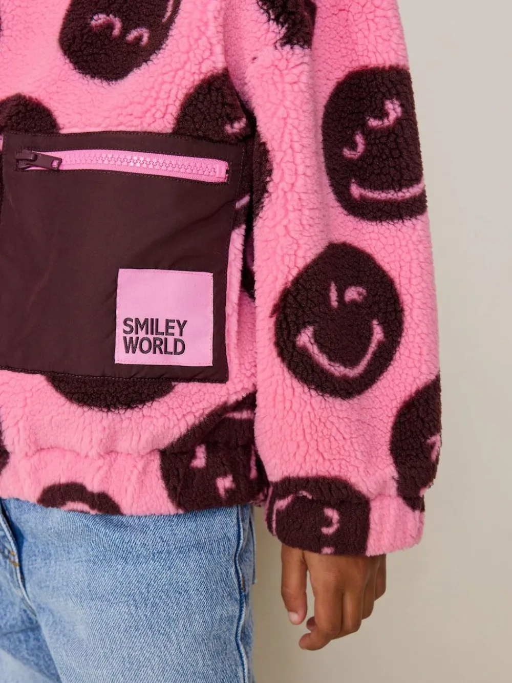 This fun Pink/Berry Smiley Zip Up Borg Jacket is a cosy and stylish layering piece. Made from borg fleece, the jacket features super soft fabric and a playful all-over smiley face print with contrast patch pockets. Super soft Borg fleece Zip up front Smiley face print Patch pockets Main 100% Recycled polyester. Lining 100% Recycled polyester.
