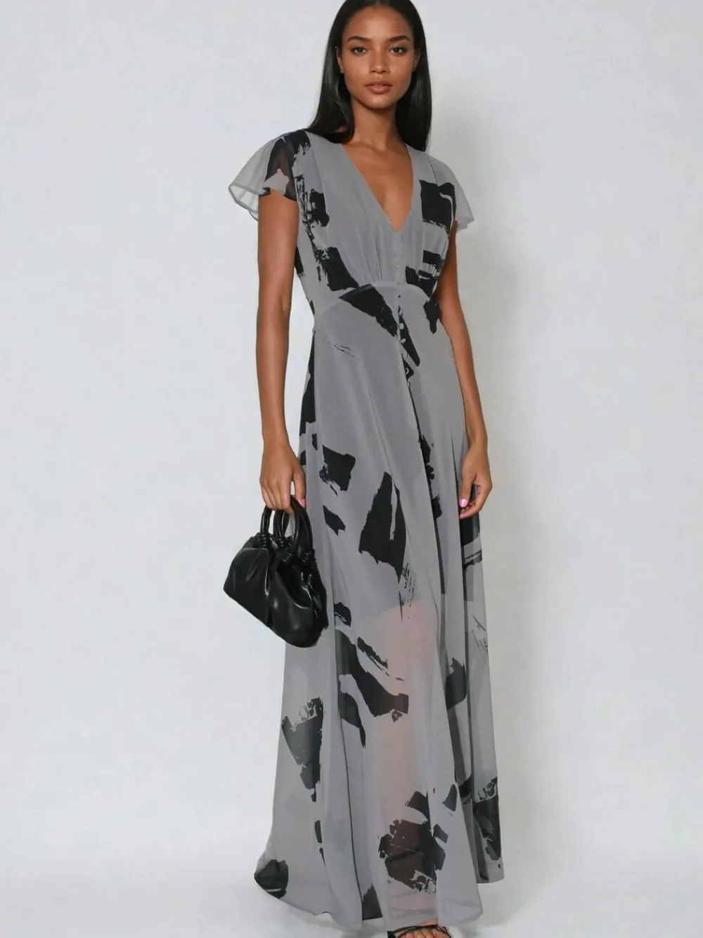 The Indium maxi dress is a stunning blend of elegance and sophistication, in our abstract Facade print in soft grey with black. This flattering, bias-cut dress features a deep V-neckline and short, floaty sleeves, offering a timeless and graceful silhouette. The maxi length and centre front slit add a touch of allure, while the fine faux button detailing enhances its classic charm. Perfect for any special occasion, the Indium maxi dress exudes effortless style and refinement, ensuring you look and feel your best wherever you go. The model wears a size UK 10. Length from the top: 145 cm. Regular side neck to hem 57″ / 145cm. Machine washable. Shell 100% Polyester. Lining 100% Viscose.