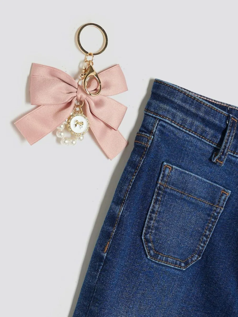 Button and zip fastening Belt loops Pocket detail Flared leg Comes with a detachable bow keyring Washable. 100% Cotton.