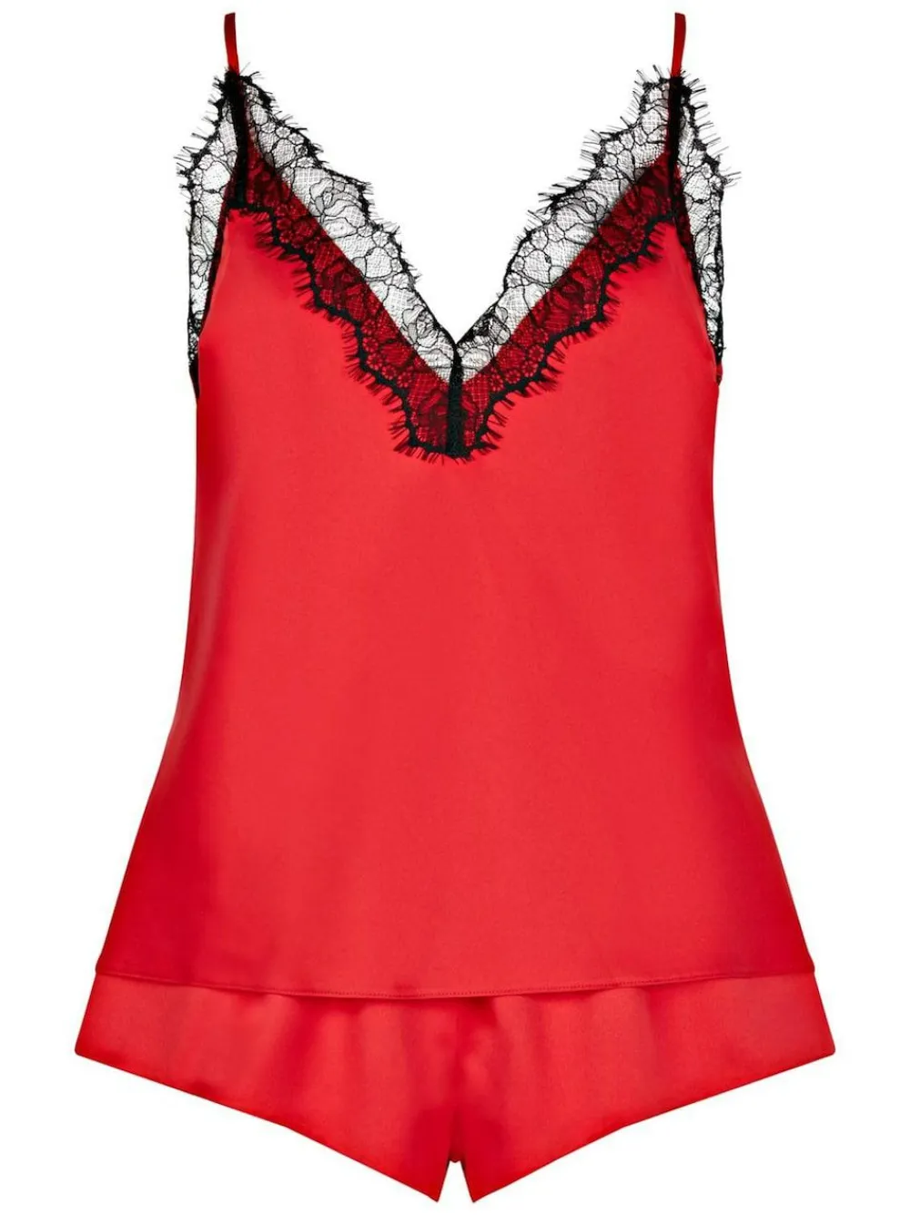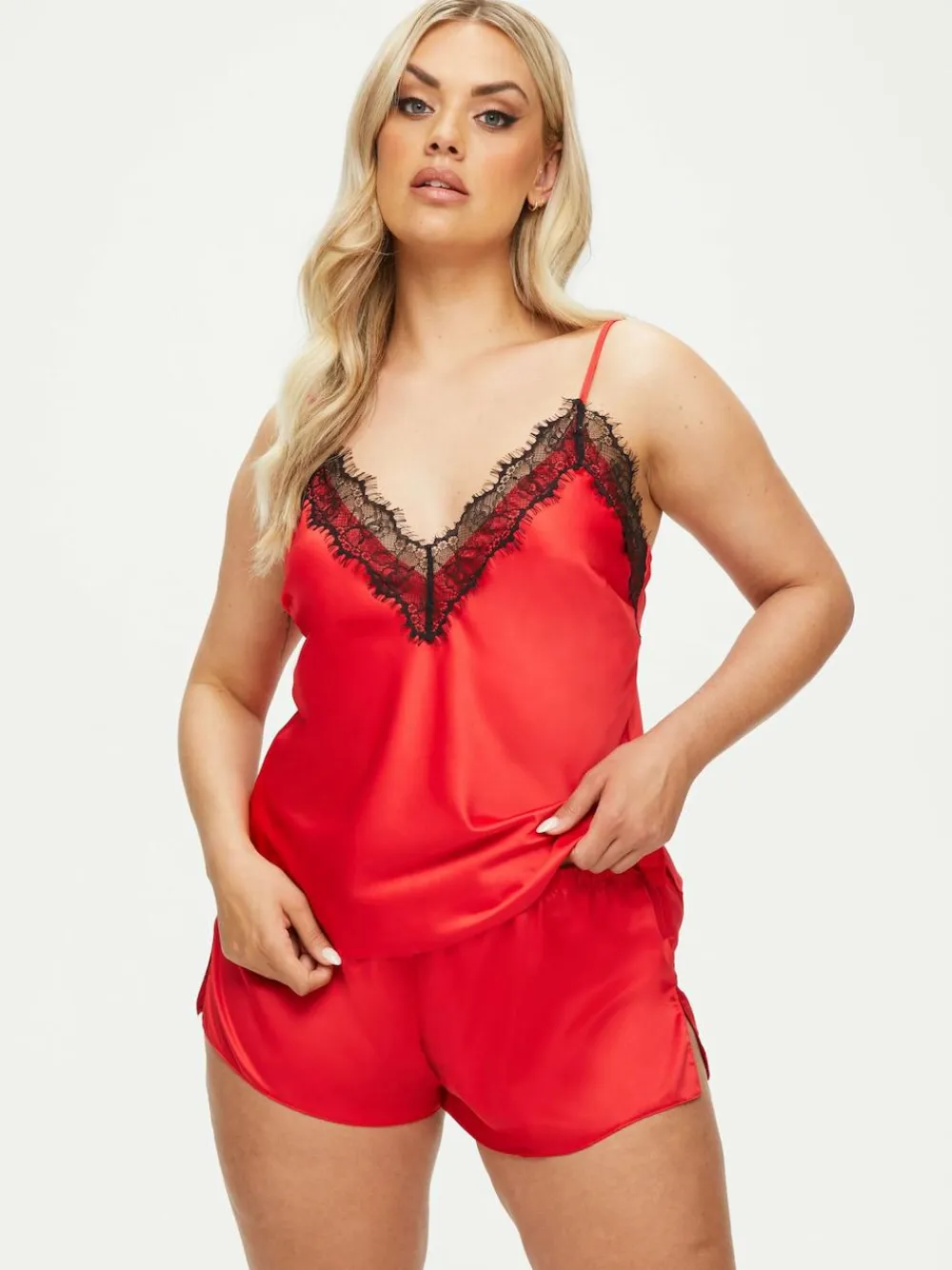 Made with lustrous satin, the Cerise Cami Set combines a vest with a deep plunging neckline edged with a seductively sheer eyelash lace trim, together with matching shorts with a lightly elasticated waistband for a great fit. Layer up with a satin robe for a romantic night in. X Small = 4-6 Small = 8-10 Medium = 12-14 Large = 16-18 X Large = 20-22 XX-Large = 22-24 Machine washable. Main 100% Polyester. Lace 100% Nylon. Warning: Keep away from fire and flames.