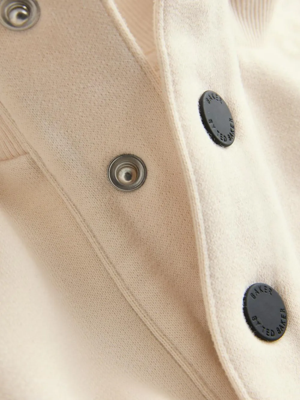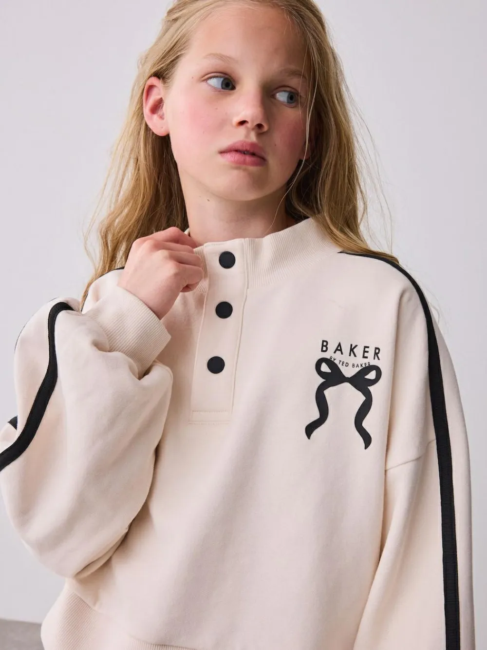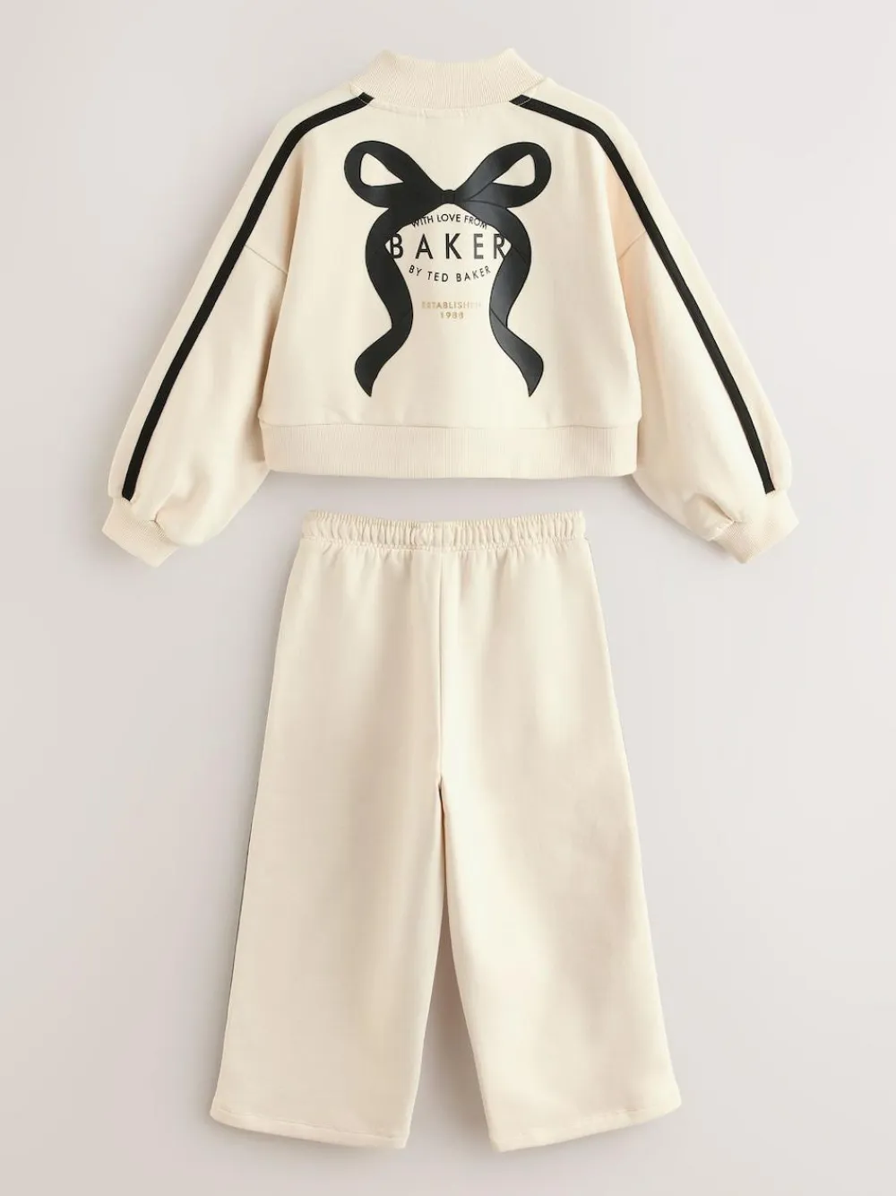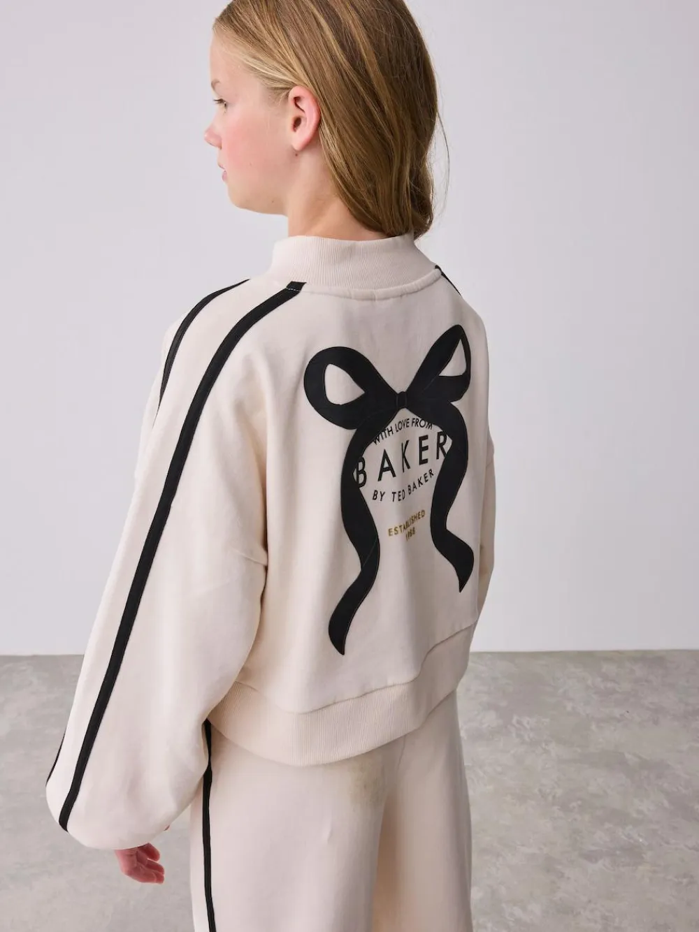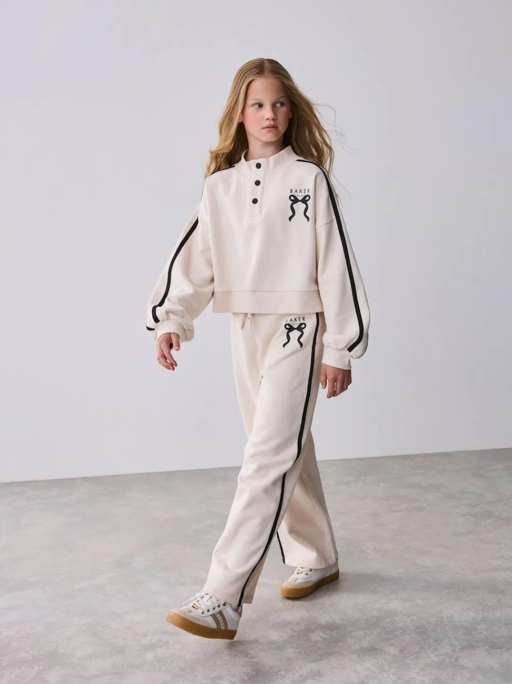 Cool, chic, and ready for autumn, she’ll fall in love with this 2 piece set from Baker by Ted Baker. The set includes a soft brushback sweat top with a funnel neck shape and a wide leg jogger, featuring black contrast piping trims down the side of the arms and legs. The sweat top also features black branded poppers, and a large bow placement print on the back, complimented with foil Baker branding. The joggers feature a printed bow on the waist, with our iconic Baker branding below. The joggers also feature functional Baker branded drawcords at the waist, with dipped ends and cream eyelets to match. Perfect for chilly days out ahead. 2 piece set Branded Baker buttons Baker printed branding Sweater and Jogger 100% Cotton.