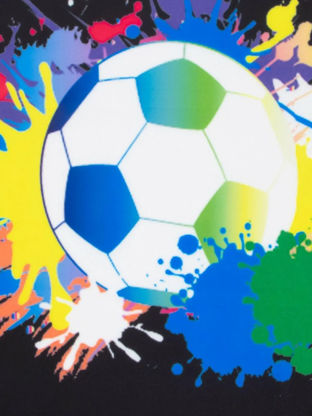 Dive into sporty fun with this dynamic black swimsuit for boys! The swim top features an exciting graphic of a football surrounded by colourful paint splashes, adding a burst of energy. The matching swim trunks continue the theme with a splash of vibrant paint and a football graphic. With an adjustable drawstring, the swim shorts offer a comfortable fit for summer days at the pool or beach. This boys’ swimming costume is ideal for young football and sports fans. Machine washable. Top 82% Polyester, 18% Elastane. Bottom 94% Polyester, 6% Elastane.