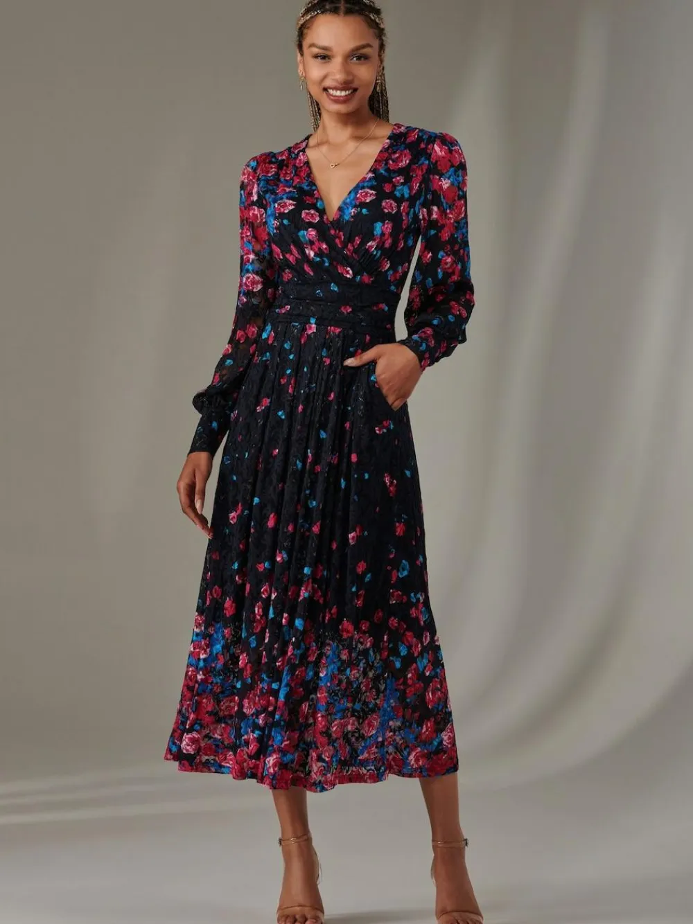 Whether for a formal event or a special night out, the Dalia Lace Maxi Dress ensures you make a lasting impression with its graceful and stylish appeal. Made from luxurious lace, this dress features long sleeves and a wrap-over V-neckline that offers a classic yet alluring look. The symmetrical floral print adds a touch of elegance, creating a beautifully balanced design. Regular side neck to hem 50.5″ / 128cm. Machine washable. 90% Polyester, 10% Nylon.