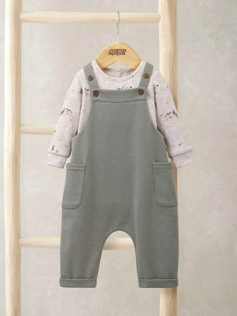Outlet Mamas & Papas Green Waffle Dungarees and Moose Print Bodysuit Set