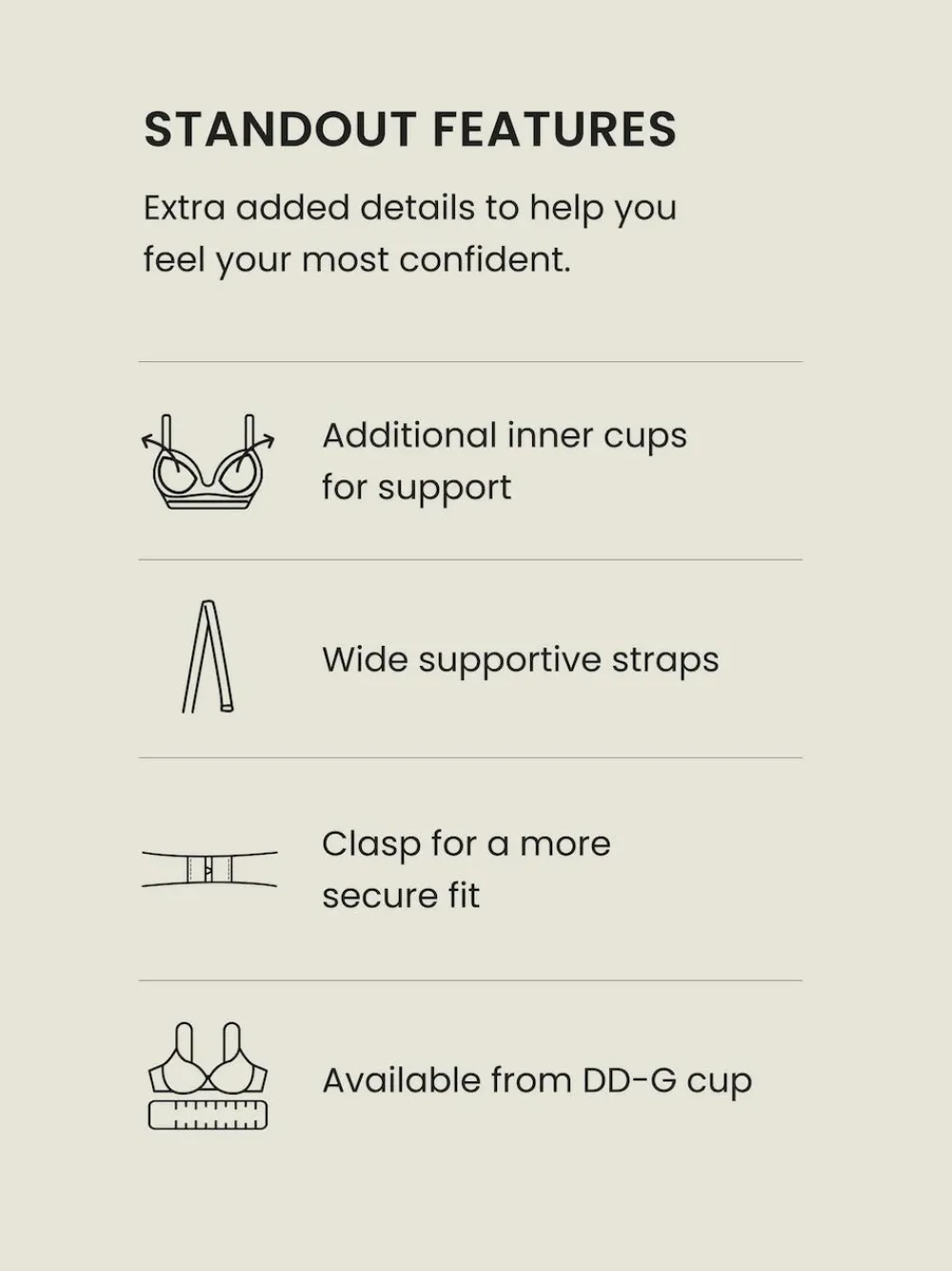 | Size | 32DDD, 32E, 32G, 32H, 32I, 34DDD, 34E, 34G |