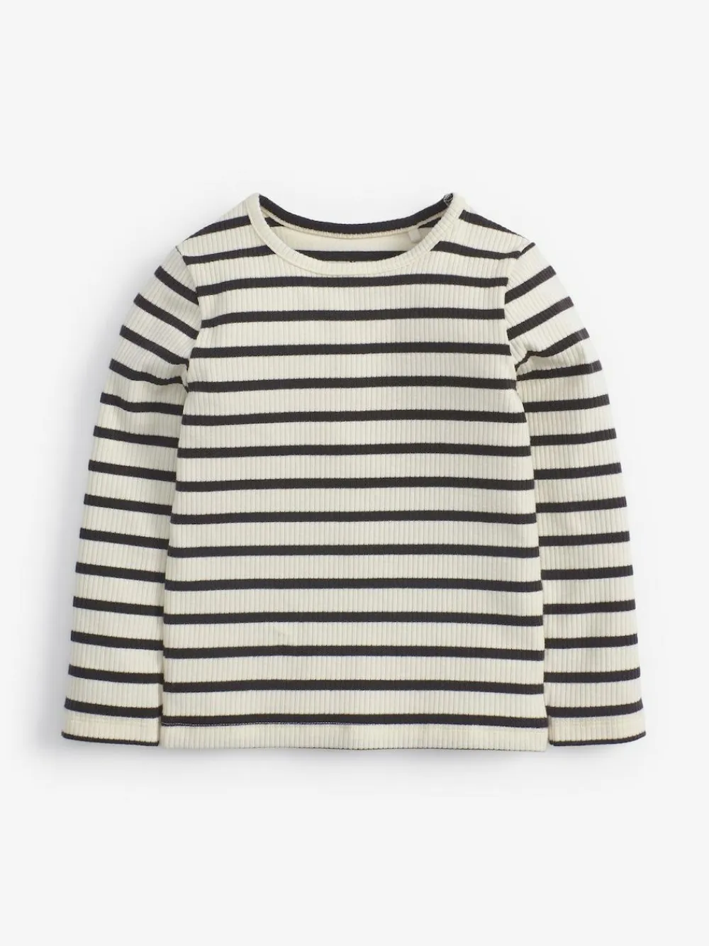 Our long sleeve rib black/white stripe t-shirt is an everyday must-have for their wardrobe. Crafted from a cotton-rich blend with added stretch, it’s perfect for everyday adventures. The black and white stripe design keeps things fun while the fluted edges add a trendy twist. Long sleeves and a crew neck offer warmth on cooler days. Add comfy joggers and their favourite pair of trainers for a cosy fit. Machine washable. 95% Cotton, 5% Elastane.