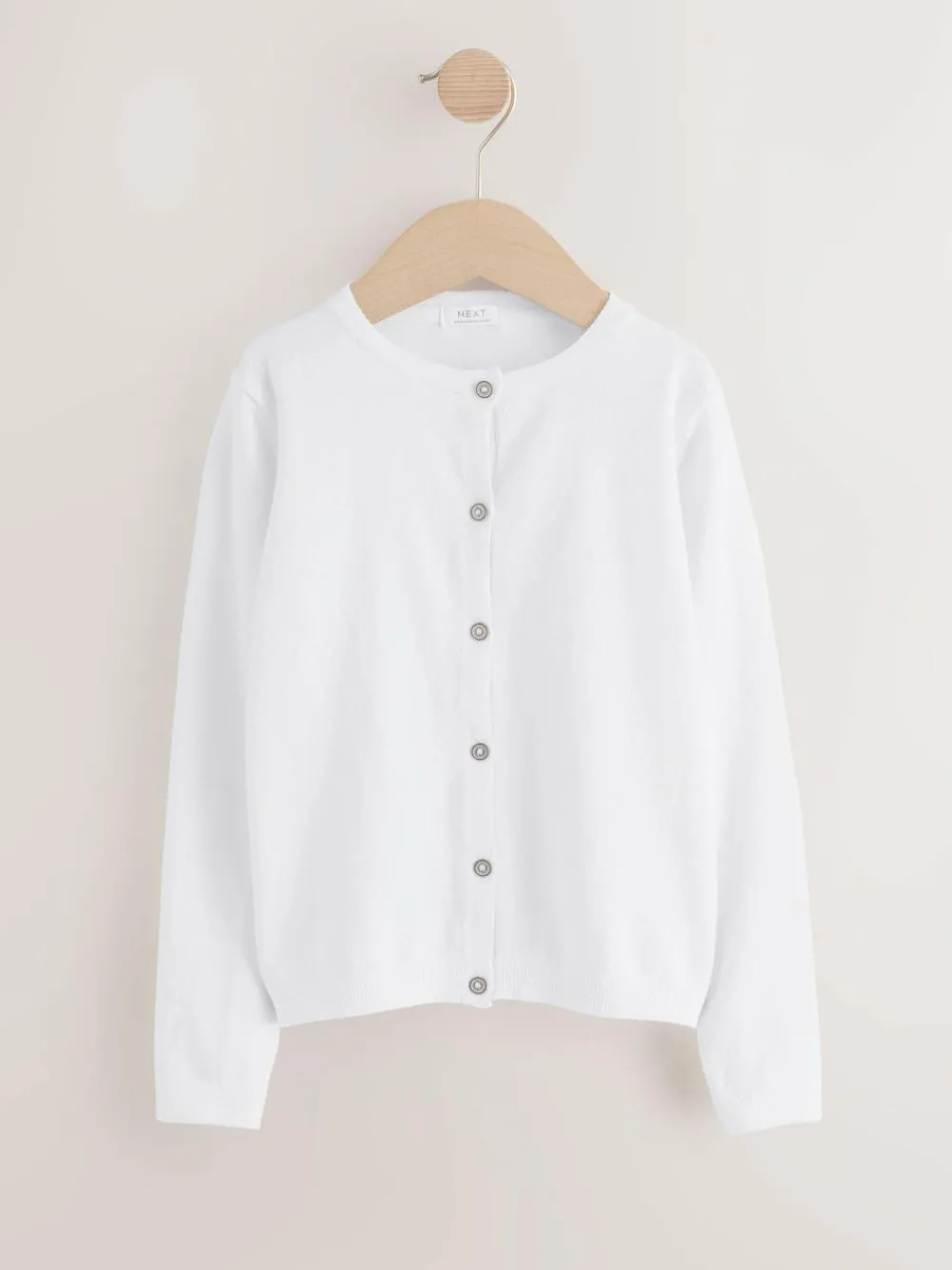 Dress up your little one in our adorable White cardigan. Woven in a soft cotton blend, this classic cardigan has a round neck with ribbed cuffs and button fastenings down the front. A patch pocket completes this beautiful piece that will be perfect for layering up over dresses and T-Shirts. Machine washable. 80% Cotton, 17% Nylon, 3% Elastane.