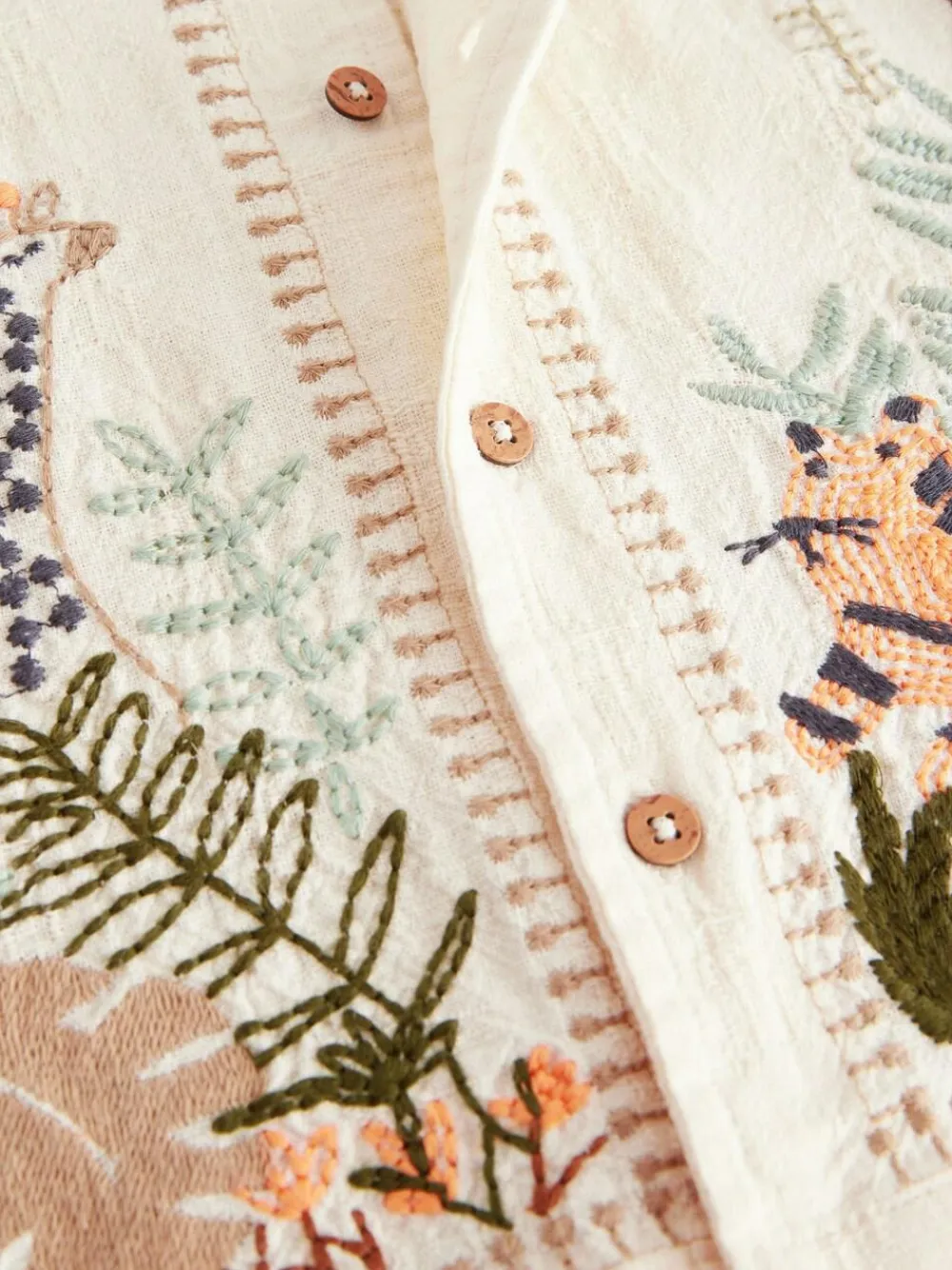 Perfect for a summer holiday, this ecru white pure-cotton short sleeve shirt has a button-up fastening, a textured feel and embroidered safari detailing that’s both smart looking and fun, finished with a classic collar. 100% cotton Textured fabric Safari embroidered design Button-up fastening Classic collar 100% Cotton.