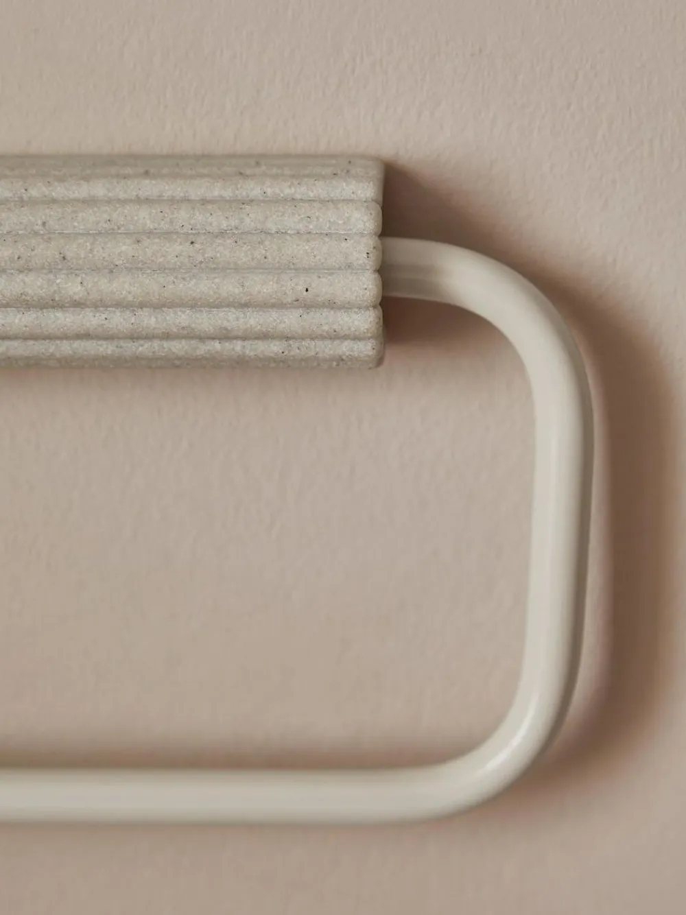 Part of our Natural Rib Collection, this towel ring features a resin backplate inspired by Scandinavian design influences. You can secure the ribbed toilet roll holder in two ways: with wall plugs & screws or a 3M adhesive pad, as shown in the assembly instructions. Wall fixtures and fittings are included – please choose the suitable screws and plugs for your wall type. Height 2.5cm Width 15cm Depth 11cm 42% Metal, 34% Resin, 24% Zinc Alloy. Click here to see assembly instructions This item has been tested to ensure it is bathroom suitable and protects against corrosion and distortion from steam.