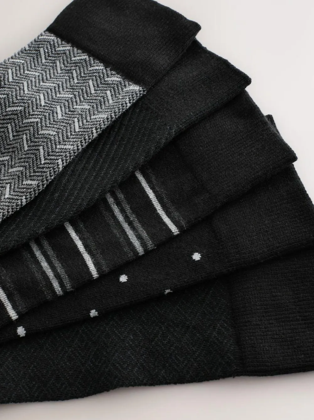 Stay fresh all day with this five-pack of smart, black and grey socks. Featuring a variety of herringbone, stripe and spot patterns, they are designed with Biome Active Freshness technology to keep your socks fresh and odour-free. 5-pack Biome Active Freshness Herringbone, stripe and spot patterns Machine washable. 5 x Socks 72% Cotton, 26% Nylon, 2% Lycra® Elastane.