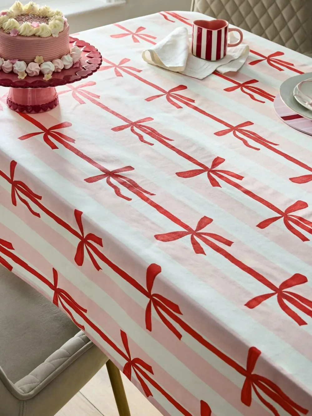 Brighten up any meal with this stylish pink and red bow print tablecloth. Made from 100% cotton with a wipe-clean coating, it’s both pretty and incredibly practical – just pop it in the wash when needed! Rec Small Length 137cm / Width 179cm Rec Large Length 137cm / Width 229cm Rec XL Length 160cm / Width 280cm Machine washable. 100% Cotton.