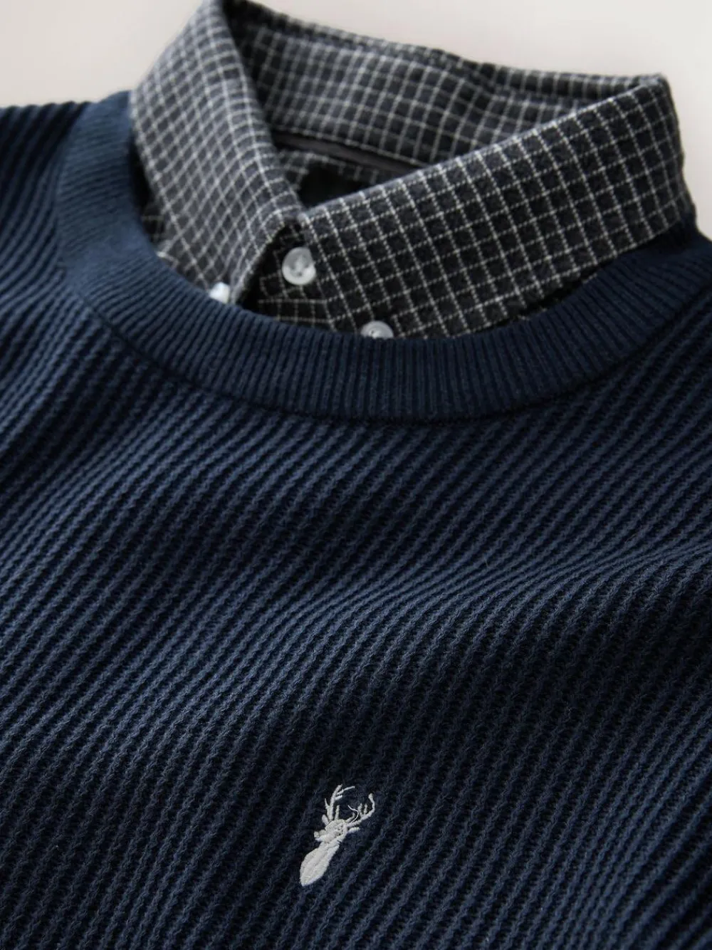 Effortlessly elevate your smart-casual wardrobe with this stylish ribbed knit jumper. Designed for a regular fit, this piece offers both comfort and a clean silhouette. The ribbed texture knit provides a contemporary feel and excellent structure, while the integrated mock Oxford shirt detail at the neckline creates the perfect sophisticated layered look. Simply pull it on for instant polished style. Comfortable regular fit Ribbed texture knit crew neck jumper Mock Oxford shirt collar insert Available in standard sizes Best for smart-casual wear Machine washable. Main 100% Cotton. Collar 100% Cotton.