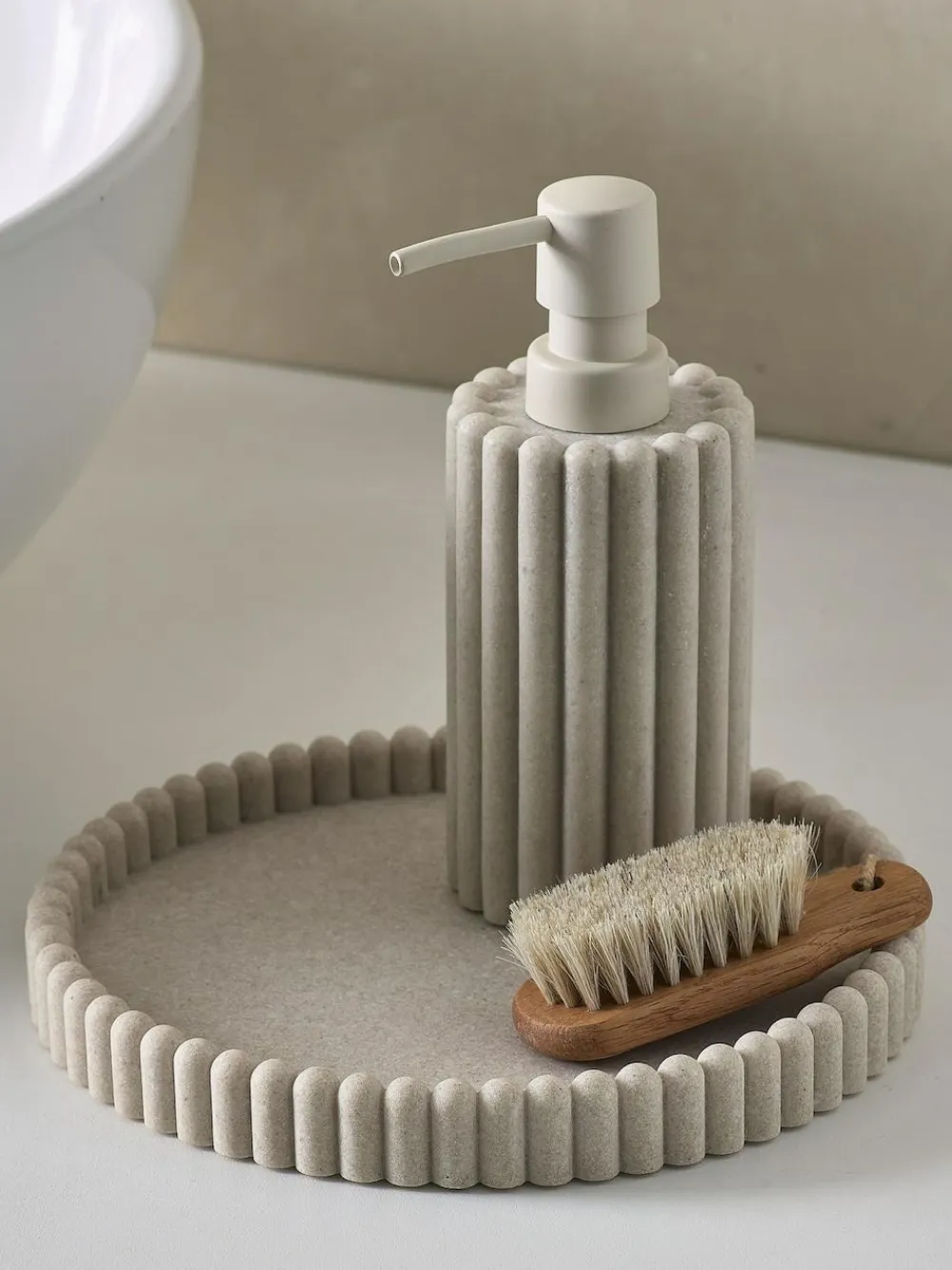 Our natural round tray is a small but nifty piece of storage. With a textured rib finish, it makes an attractive addition anywhere in your home. Whether it’s for the soap in the bathroom or for the jewellery on your dresser, use it organise your favourite little bits and bobs in style. Inspired by clean, Scandinavian design elements, it’s a neat little solution to keep everything in check. Width 21cm Depth 21cm 100% Resin. This item has been tested to ensure it is bathroom suitable and protects against corrosion and distortion from steam.