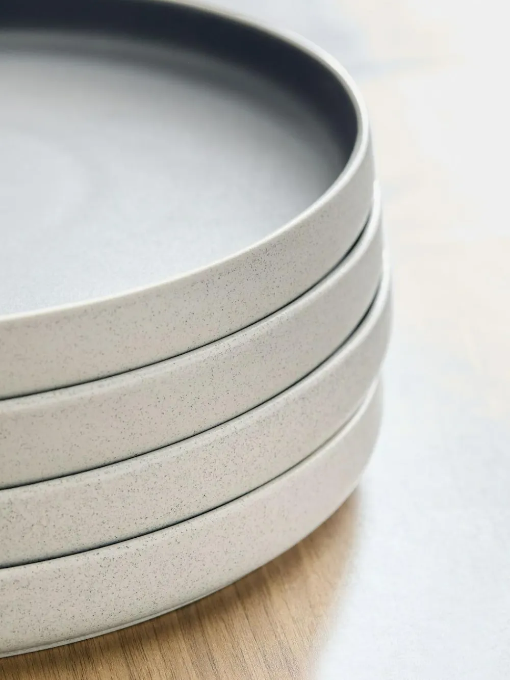 Otis is a modern, flat side profile shape dinner plate. In a stylish matte finish, the plates are a black glaze on the inside, with a soft, speckled grey on the outside. The perfect way to elevate your meal times, this set is great for both casual and formal dining. Made from durable stoneware which is both practical and long lasting. Height 3cm Width 26cm Depth 26cm 4 x Dinner Plate 100% Stoneware. Dishwasher safe, microwaveable.