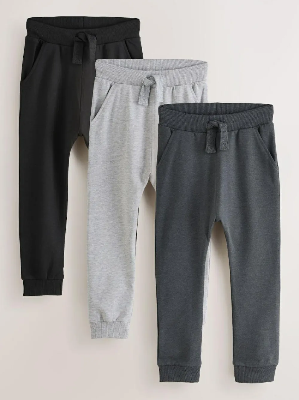 Pack of 3 260 GSM fabric Skinny fit Adjustable waistband with drawcords Cuffed ankles Side pockets Jogger Black 95% Cotton, 5% Elastane. Jogger Charcoal 57% Cotton, 38% Polyester, 5% Elastane. Jogger Grey 85% Cotton, 10% Viscose, 5% Elastane.
