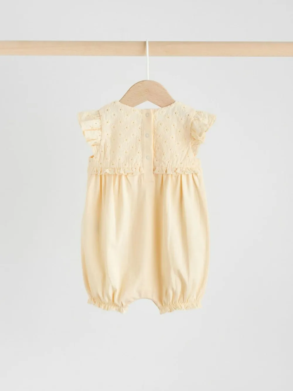 This beautiful Pink Broderie 3 Pack Baby Rompers set offers charming style and comfort for everyday wear. Each romper features delicate Broderie front and shoulder detail for an intricate, premium look. Designed for fuss-free changes, they include a practical popper back neck opening and a neat woven side tab. Broderie front and shoulder detail Woven side tab Popper back neck opening 3 Pack Rompers Machine washable. 3 x Romper Main 100% Cotton. Yoke 100% Cotton. Warning: Keep away from fire and flames.