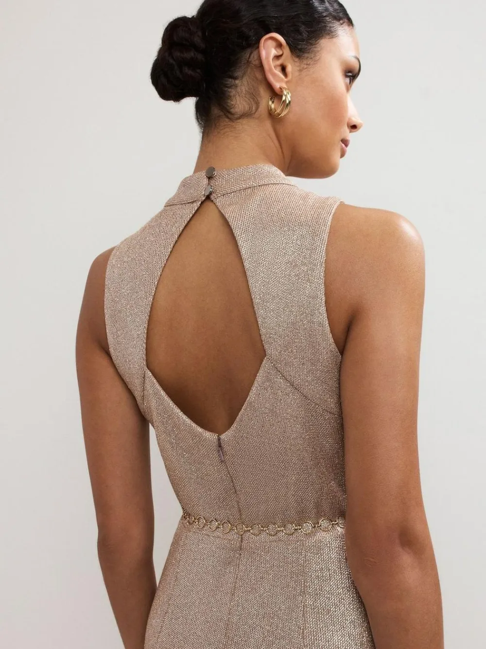Shimmer all through the night. Made from jersey with a metallic fibre threaded throughout, this event dress comes with a detachable gold belt to add to the shine. Featuring a peephole neckline and flattering exposed back, it’s the definition of Hollywood glamour. Model Wears: UK10, 5’9”. Machine washable. 100% Elastane.