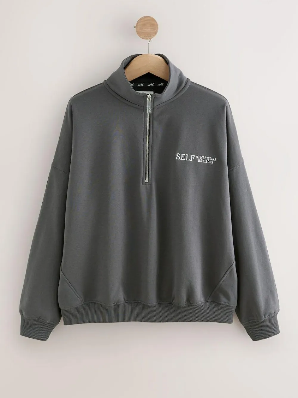 Layer up in style with this charcoal grey half zip sweatshirt by self. Designed in a relaxed fit with ribbed cuffs, a zip neck fastening and embroidered self. logo Sweatshirt Half zip neck Relaxed fit Ribbed cuffs 56% Cotton, 44% Recycled polyester. Warning: Keep away from fire and flames.