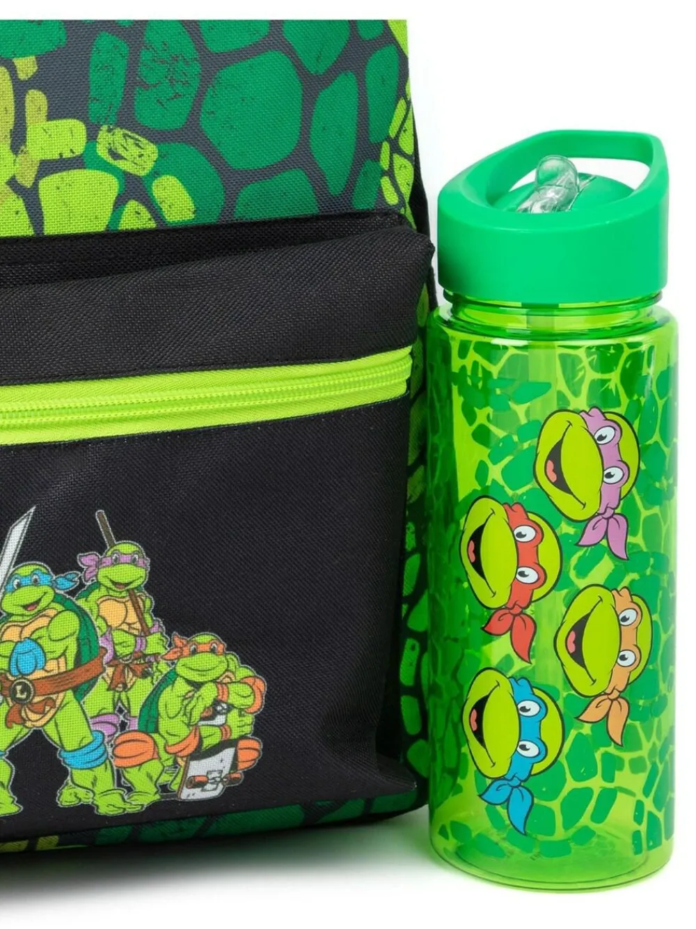 Get them ready to join the Teenage Mutant Ninja Turtles in their latest adventure. Then look no further than this epic 4-piece backpack set!With Donatello, Raphael, Michelangelo and Leonardo ready for action, they’ll have all the help they need to make their school day and adventures more magical than ever. This backpack is sure to turn heads wherever they go, featuring a black and green design with an all-over print of the turtles’ iconic shells. And with a lunch bag that showcases the TMNT’s favourite food – pizza! But that’s not all – this set also comes with a water bottle and pencil case, so they can keep all their stationery organised and within reach.Product DetailsSet Includes: Backpack – with main zip compartment, mesh bottle holder, front zip pocket, adjustable straps Measures approximately 36x26x12cm Lunch Bag – Insulated with a carry handleMeasures 21x20x9.5cm Pencil Case measures 20x8cm 500ml Water Bottle BPA Free Materials – Bag, Lunch Bag & Pencil case are constructed from 100% Polyester 50% Polyester, 50% Plastic.