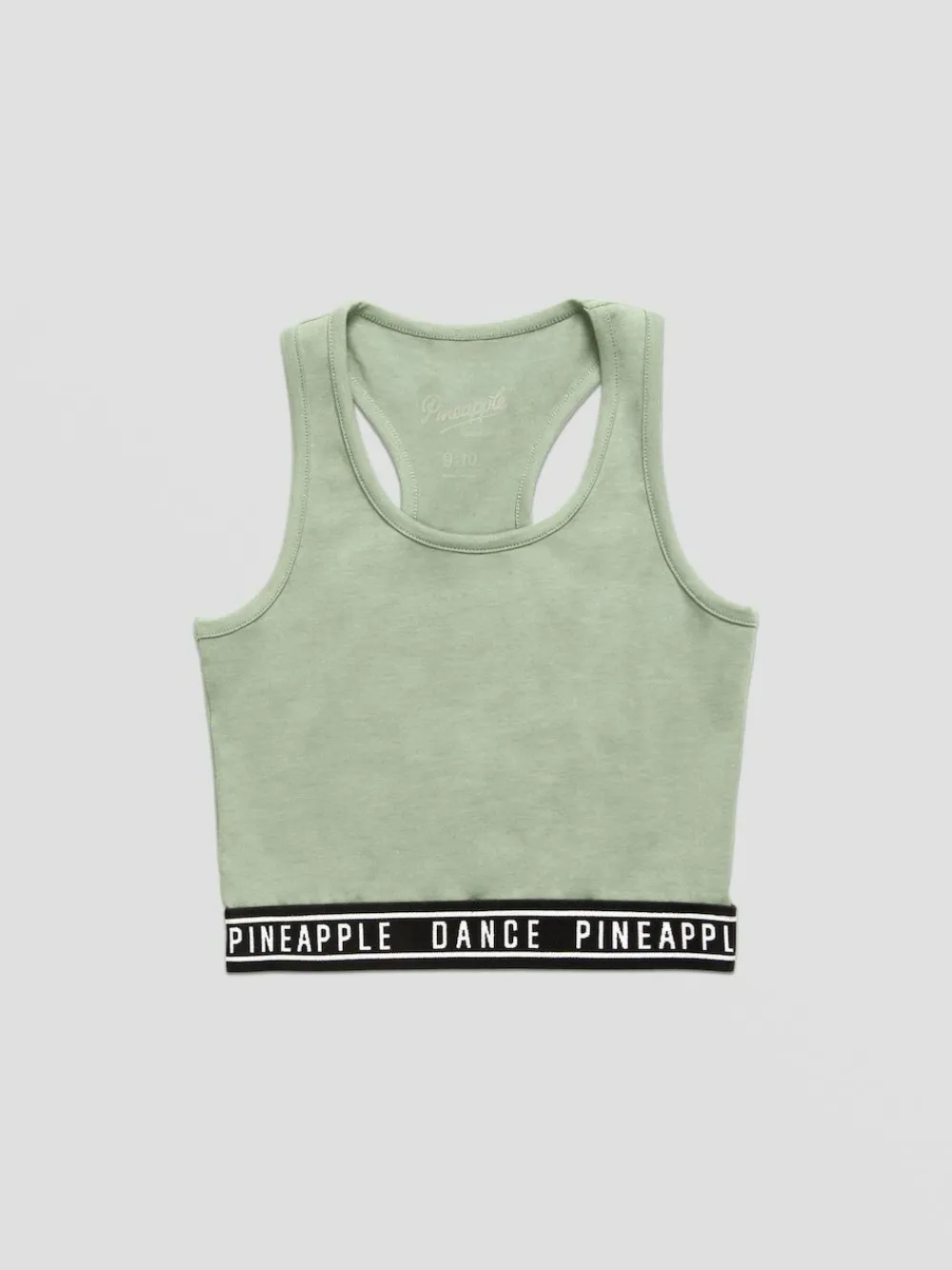 Step up your dance game with this Sage green tape hem midi crop top for girls. This stretchy, fitted crop top features a high neckline and a black elasticated Pineapple Dance waistband for a sporty yet chic look. Crafted from super soft cotton-rich fabric, it’s a favourite for dance practice and casual outings in the summer. Also available in Black! Stretchy & Fitted Black Elasticated Tape Hem Matching Co-ords Available Fabric: Cotton & Elastane The model is wearing size 11-12 years. Machine washable. 95% Cotton, 5% Elastane.