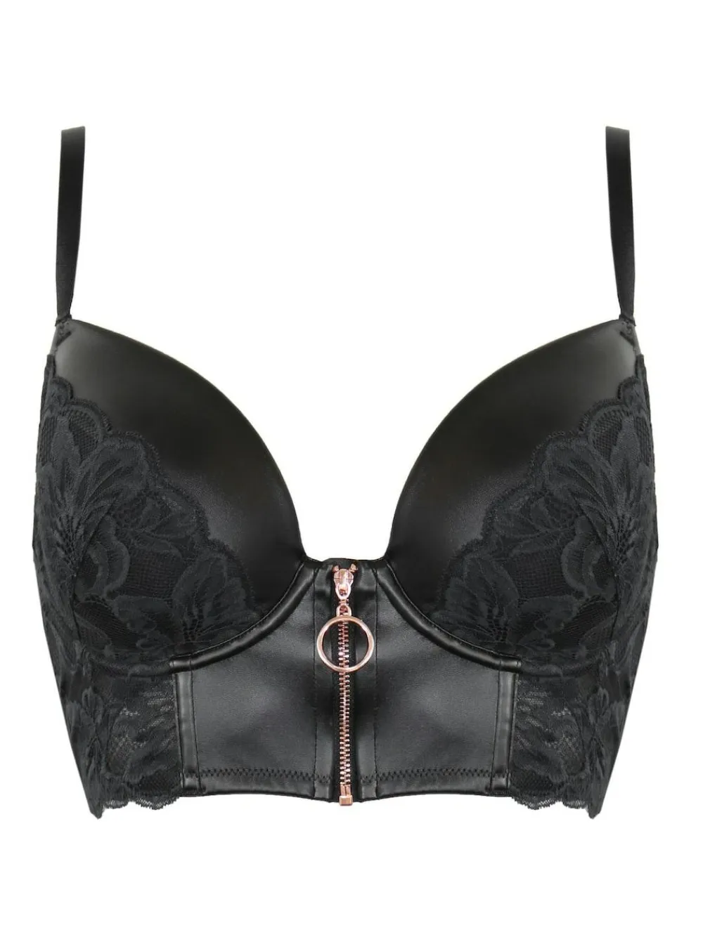 We’ve got the perfect lingerie piece for those that want both sexiness and comfort. With its underwired construction and lightly padded plunging shape, it provides a flattering and supportive fit that complements your natural figure. The opulent lace with contrasting liner adds a touch of luxury while the soft PU faux leather panels create a striking contrast and sensual vibe. The back strapping is fully adjustable to ensure a comfortable and secure fit, making this sexy lingerie style perfect for all-day wear. The unique zip front feature adds a touch of versality, allowing you to fasten it both at the front or back. Whether you’re wearing it for a special occasion or simply to add a little extra glamour to your everyday life the Onyx Zip Front Fastening Padded Longline Bra and matching knickers are a perfect choice. Hand wash only. 59% Nylon, 33% Polyester, 8% Elastane.