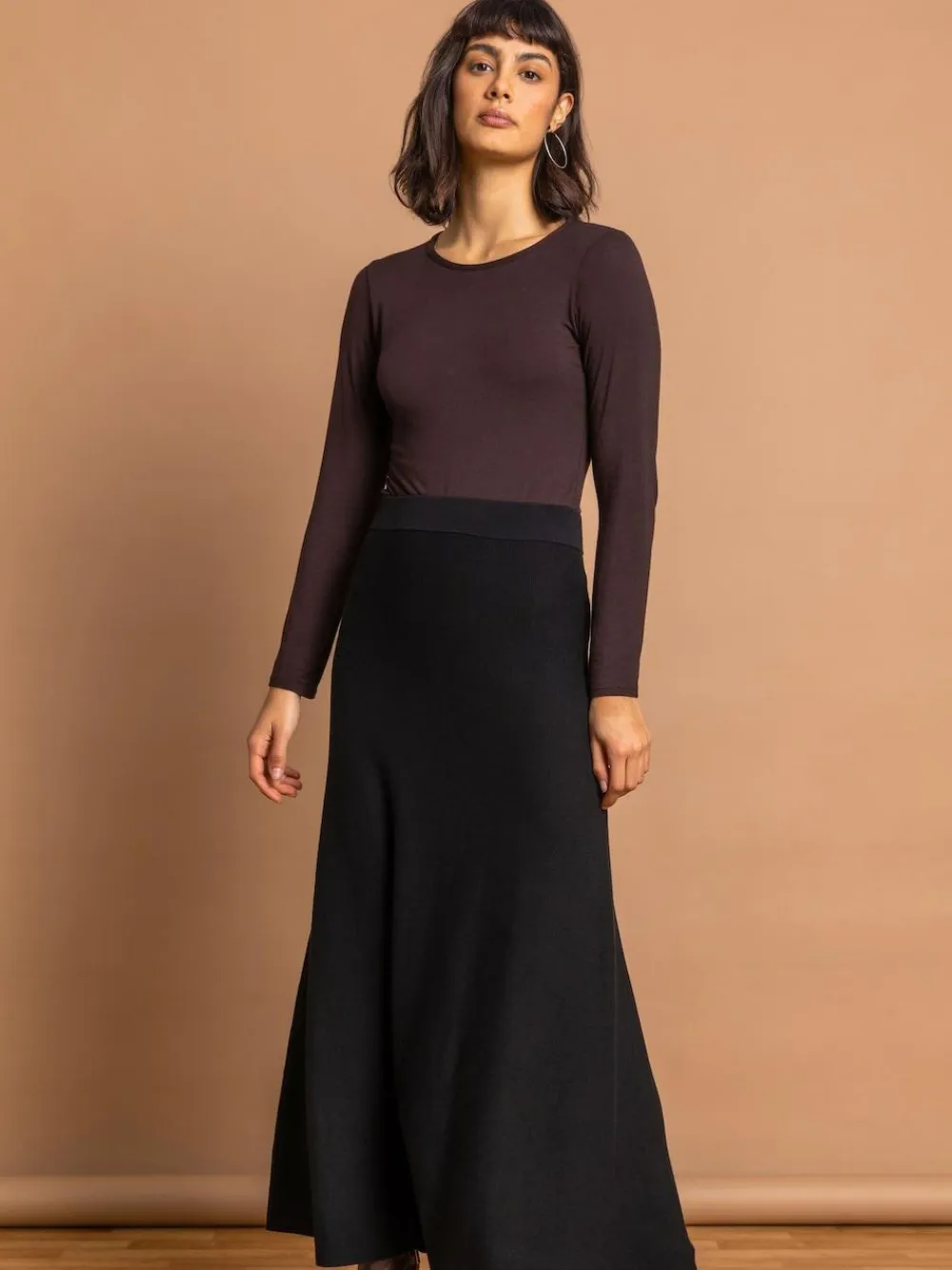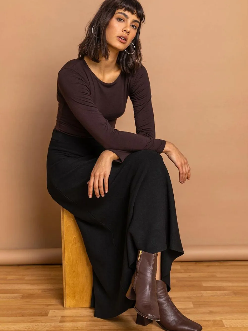 Keep it classic with our elegant, knitted midi skirt. It’s A-line shape and elasticated waistband ensure comfort for everyday wear while the midi length gives you a flattering and modest look Complete your ensemble with boots and a blouse for work or add a jumper and layer with a leather jacket for an on-trend Autumn style! Regular waistband to hem 31.5″ / 80cm. Hand wash only. 70% Viscose, 30% Nylon.