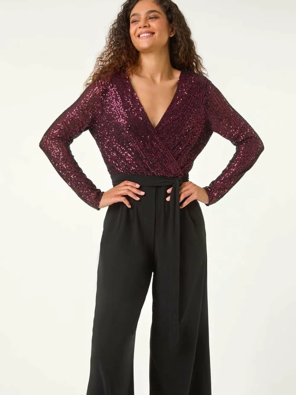 Add some sparkle to your wardrobe this Autumn Winter with our glamorous sequin wrap jumpsuit. Featuring a feminine v-neckline and long sleeves for extra warmth, this dazzling jumpsuit boasts a stunning sequin wrap bodice with a tie waist belt detail for a secure fit with back button fastenings. Crafted from a stretchy jersey fabric, this easy-to-wear piece has wide leg trousers with angled side pockets for added elegance. Pair with heels and a bolero for your next special occasion! Regular inside leg length 29.5″ / 75cm. Machine washable. 92% Polyester, 8% Elastane.